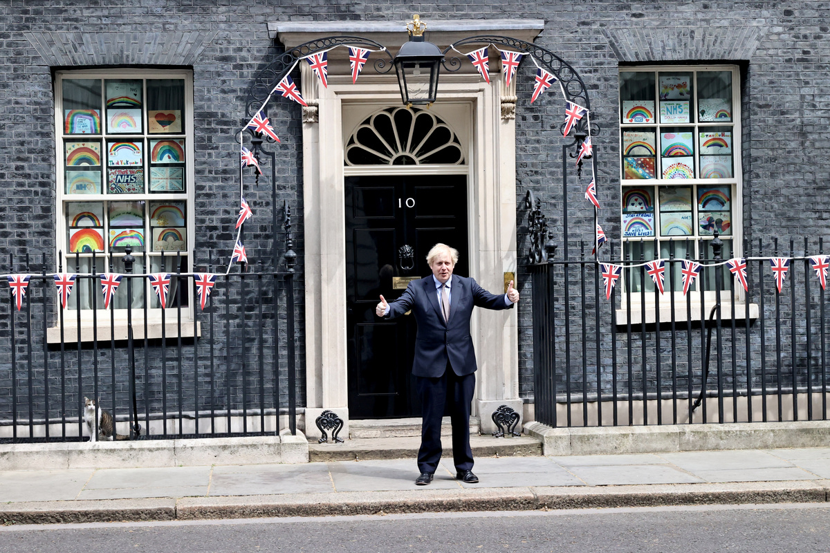 Britain's Prime Minister Boris Johnson gestures as he commemorates the 75 anniversary of Victory in Europe Day, at Downing Street, in London, Britain May 8, 2020. Jon Bond/Pool via REUTERS