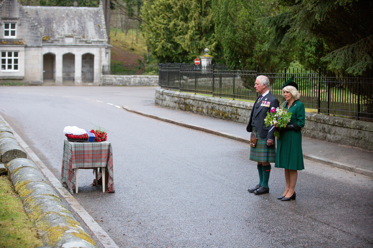 Britain's Prince of Wales and the Duchess of Cornwall (known as the Duke and Duchess of Rothesay when in Scotland) observe a two-minute silence to mark the 75th anniversary of VE Day at the Balmoral War Memorial, Scotland, Britain May 8, 2020. Amy Muir/Pool via REUTERS
