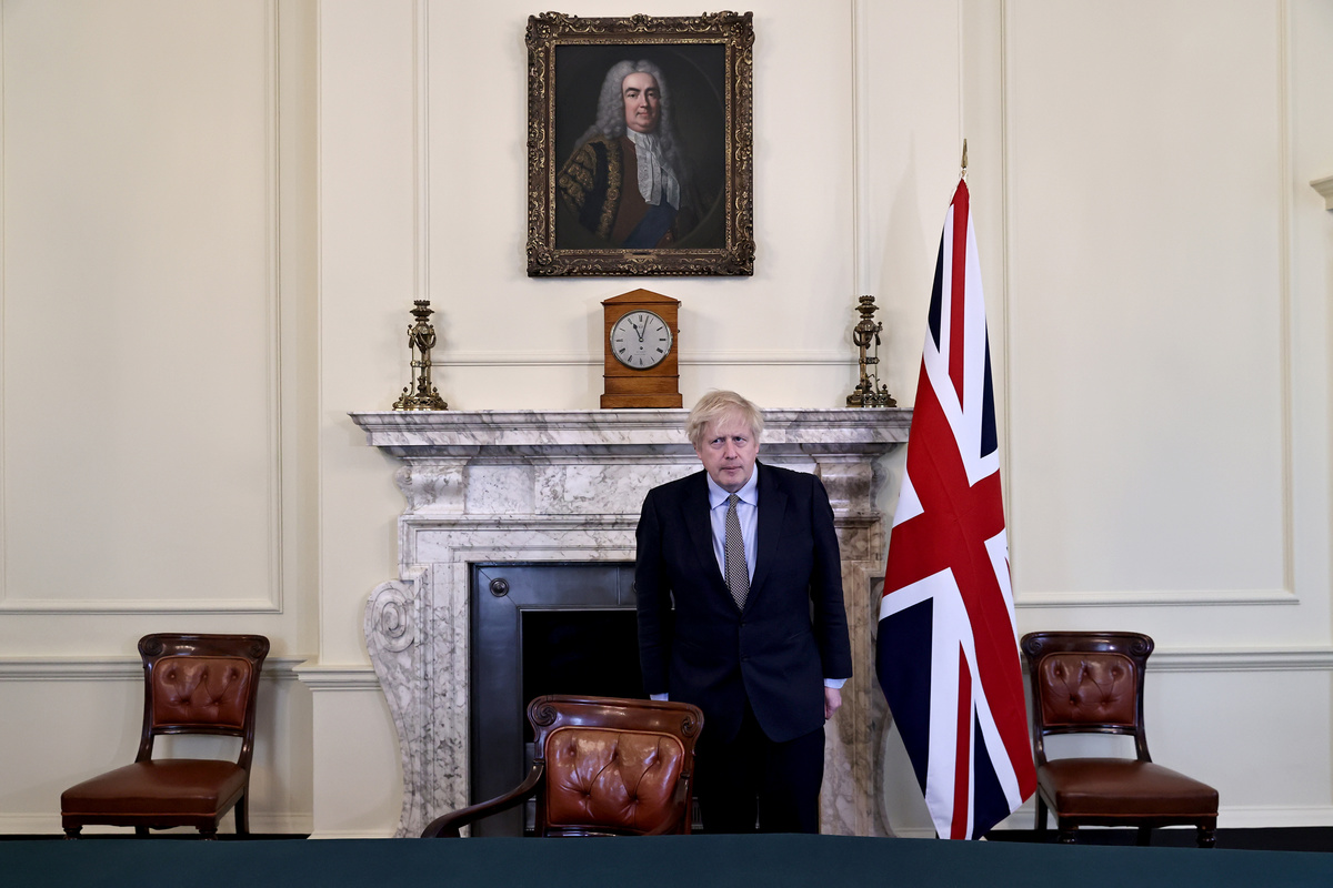 Britain's Prime Minister Boris Johnson observes a two-minute silence to commemorate the 75 anniversary of Victory in Europe Day, at Downing Street, in London, Britain May 8, 2020. Jon Bond/Pool via REUTERS