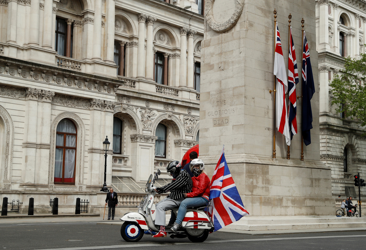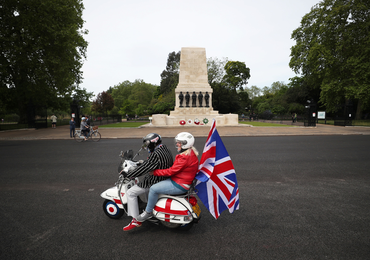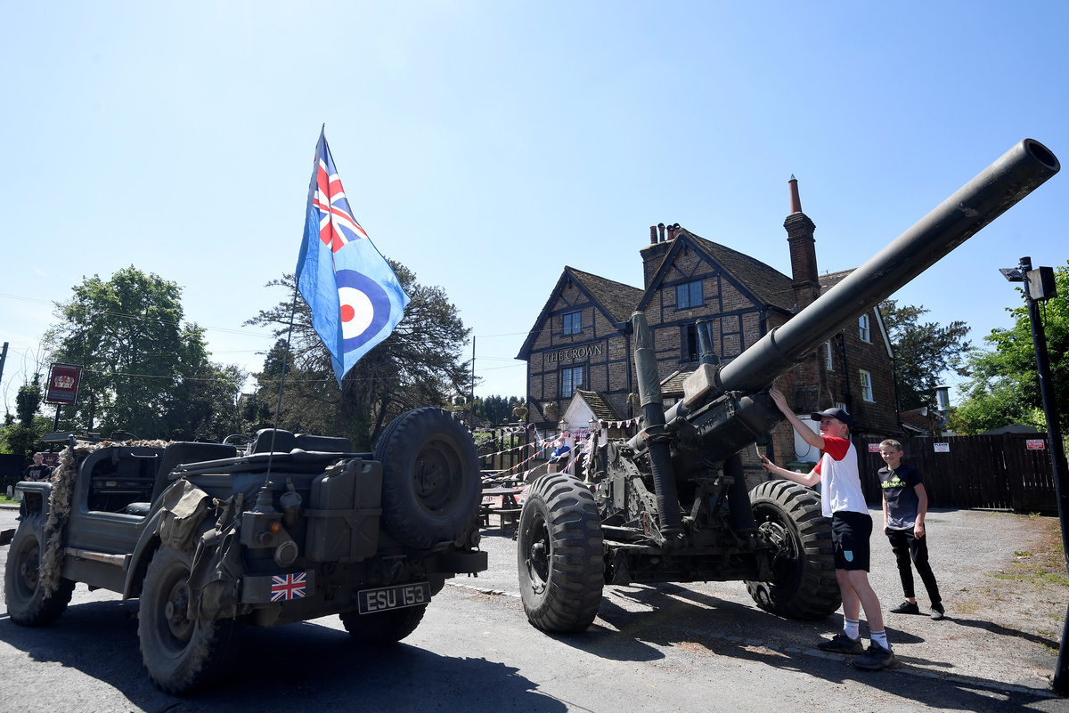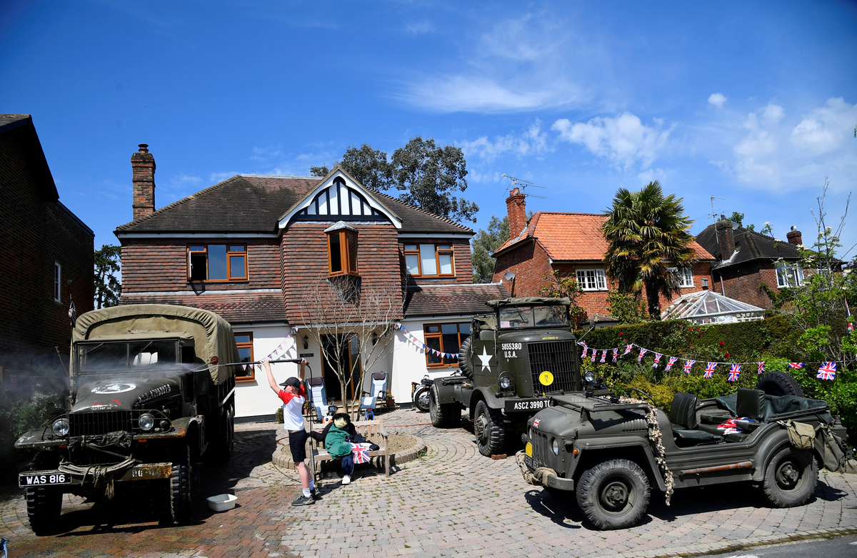 Phil Middleton selects war time music outside their home in Capel on the 75th Anniversary of VE Day, Capel, Britain, May 8, 2020. REUTERS/Toby MelvillePhil and Joy Middleton dance outside their home in Capel on the 75th Anniversary of VE Day, Capel, Britain, May 8, 2020. REUTERS/Toby MelvilleA house is seen with a flag in Streatham to commemorate the 75th Anniversary of VE Day, London, Britain, May 8, 2020. REUTERS/Hannah McKaySinger Debbie Watt representing Care Entertainment sings 1940's songs on the 75th Anniversary of VE Day. She maintains social distancing while entertaining residents and staff in the garden of Ashgreen House Residential and Nursing Home in Woolwich. It is her first performance following the outbreak of the coronavirus disease (COVID-19), London, Britain, May 8, 2020. REUTERS/Steven WattBen and Jack clean classic military vehicles in Capel on the 75th Anniversary of VE Day, Capel, Britain, May 8, 2020. REUTERS/Toby MelvilleBritain's Prince of Wales and the Duchess of Cornwall (known as the Duke and Duchess of Rothesay when in Scotland) arrive to observe a two-minute silence to mark the 75th anniversary of VE Day at the Balmoral War Memorial, Scotland, Britain May 8, 2020. Amy Muir/Pool via REUTERSNewcastle-under-Lyme town crier Gordon Brayford is seen at a street party on the 75th Anniversary of VE Day, Newcastle-under-Lyme, Britain, May 8, 2020. REUTERS/Carl RecineBen and Jack clean classic military vehicles in Capel on the 75th Anniversary of VE Day, Capel, Britain, May 8, 2020. REUTERS/Toby MelvilleA veteran at The Cenotaph in Westminster during a two minute silence on the 75th Anniversary of VE Day in London, Britain, May 8, 2020. REUTERS/John SibleyThe British Royal Air Force Red Arrows conduct a fly past over London to commemorate the 75th Anniversary of Victory in Europe (VE75) in Britain May 8, 2020. UK Ministry of Defence/Crown Copyright 2020/Handout via REUTERS The Royal Air Force Aerobatic Team Red Arrows fly past the City of London on the 75th Anniversary of VE Day in London, Britain, May 8, 2020. REUTERS/Toby MelvilleThe Royal Air Force Aerobatic Team Red Arrows fly past Buckingham Palace on the 75th Anniversary of VE Day in London, Britain, May 8, 2020. REUTERS/John SibleySenior officers and soldiers of the Household Division before a two minute silence to commemorate the 75th Anniversary of VE Day at Horse Guards, London, Britain, May 8, 2020. REUTERS/Hannah McKayPeople observe a two minute silence to commemorate the 75th Anniversary of VE Day in St James's Park, London, Britain, May 8, 2020. REUTERS/Hannah McKayPeople stand for a two-minute silence at Wimbledon War Memorial to commemorate the 75th Anniversary of VE Day, in London, Britain, May 8, 2020. REUTERS/Kevin CoombsPeople walk past Wimbledon Windmill decorated with flags on the 75th Anniversary of VE Day, in London, Britain, May 8, 2020. REUTERS/Kevin CoombsThe Royal Air Force Aerobatic Team Red Arrows fly past Buckingham Palace on the 75th Anniversary of VE Day in London, Britain, May 8, 2020. REUTERS/John SibleyParamedics and a firefighter during a two minute silence to commemorate the 75th Anniversary of VE Day in St James's Park, London, Britain, May 8, 2020. REUTERS/Hannah McKayA veteran is applauded at The Cenotaph in Westminster during a two minute silence on the 75th Anniversary of VE Day in London, Britain, May 8, 2020. REUTERS/John SibleyPeople are seen riding a bike infront of The Cenotaph on the 75th Anniversary of VE Day in London, Britain, May 8, 2020. REUTERS/John SibleyA veteran is applauded at The Cenotaph in Westminster during a two minute silence on the 75th Anniversary of VE Day in London, Britain, May 8, 2020. REUTERS/John SibleySenior officers and soldiers of the Household Division salute before a two minute silence to commemorate the 75th Anniversary of VE Day at Horse Guards, London, Britain, May 8, 2020. REUTERS/Hannah McKayPeople on a scooter with the Union Jack flag in front of Guards Memorial in St James's Park after a two minute silence to commemorate the 75th Anniversary of VE Day, London, Britain, May 8, 2020. REUTERS/Hannah McKayThe British Royal Air Force Red Arrows conduct a fly past over the Runnymede Air Forces Memorial to commemorate the 75th Anniversary of Victory in Europe (VE75) in Britain May 8, 2020. UK Ministry of Defence/Crown Copyright 2020/Handout via REUTERS Residents of Hale during a two minute silence on the 75th Anniversary of VE Day in Hale, Britain, May 8, 2020. REUTERS/Phil NobleVeterans and ambulance workers at The Cenotaph in Westminster on the 75th Anniversary of VE Day in London, Britain, May 8, 2020. REUTERS/John SibleyA person poses for a picture infront of The Cenotaph on the 75th Anniversary of VE Day in London, Britain, May 8, 2020. REUTERS/John SibleyGeneral view of a painting to commemorate the 75th anniversary of VE Day painted by staff of Barnton Primary School, following the outbreak of the coronavirus disease (COVID-19), Barnton, Britain, May 7, 2020. REUTERS/Molly Darlington