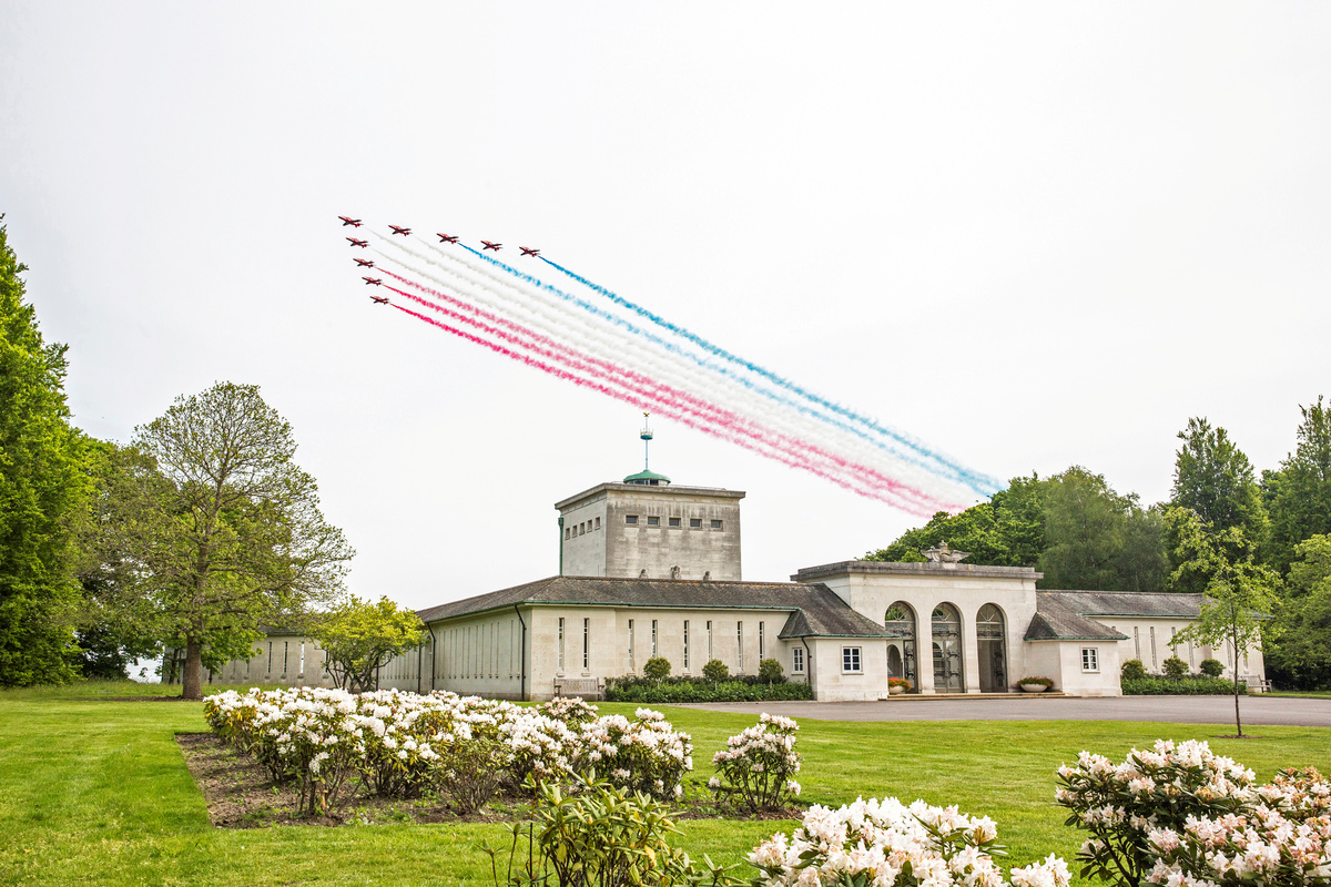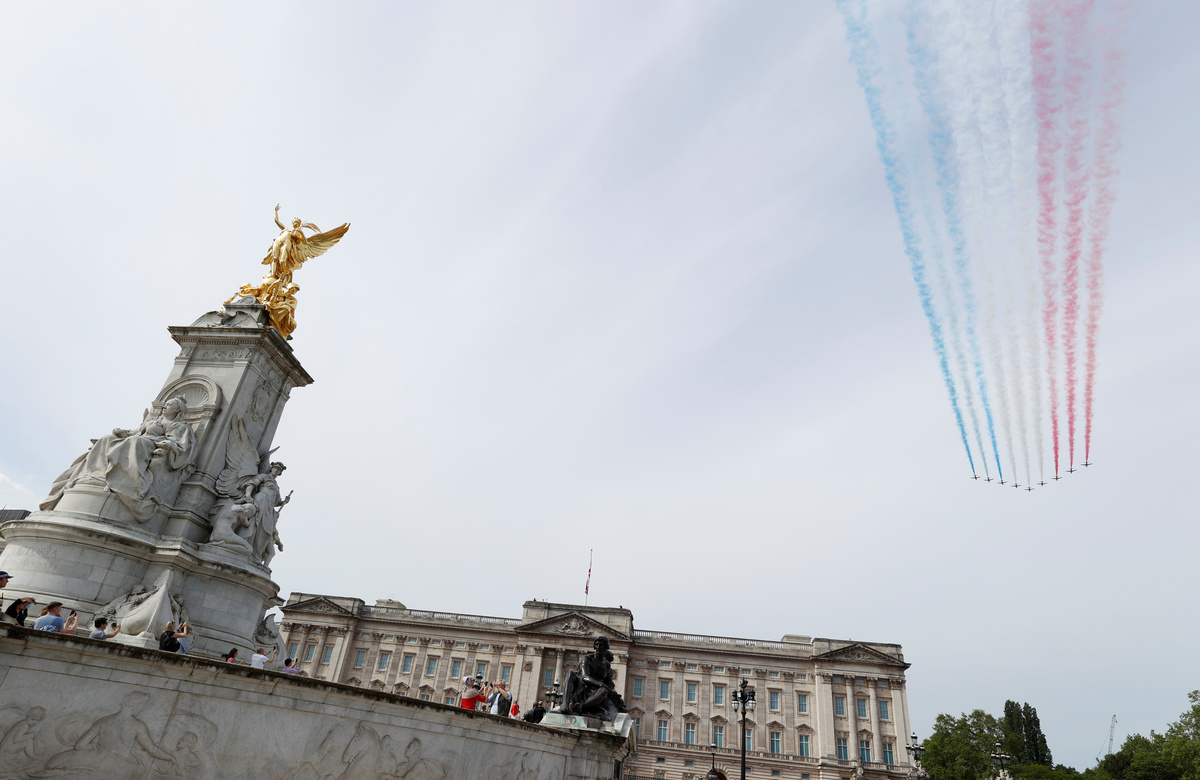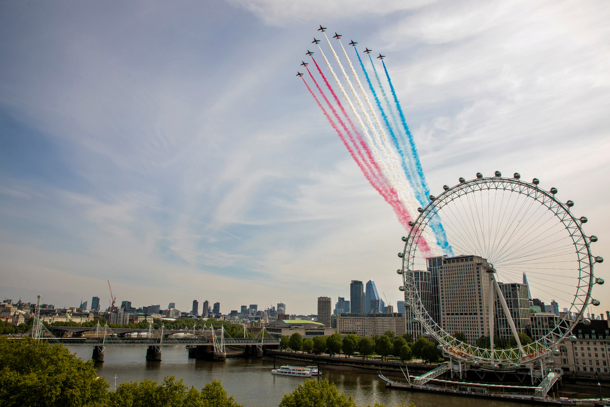 The British Royal Air Force Red Arrows conduct a fly past over the statue of former British Prime Minister Winston Churchill in London to commemorate the 75th Anniversary of Victory in Europe (VE75) in Britain May 8, 2020. UK Ministry of Defence/Crown Copyright 2020/Handout via REUTERS