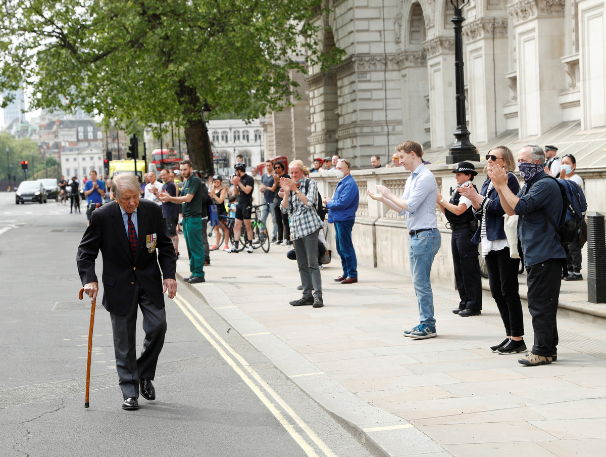A veterans' procession and other events involving crowds were scrapped, but flags and banners still fluttered, and people stuck at home due to the lockdown enjoyed a day of special television and radio programmes. On the white cliffs of Dover, a lone piper played bagpipes as wartime Spitfire planes flew by.