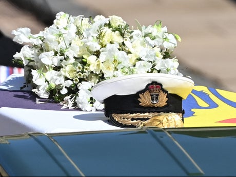 The coffin was draped in Prince Philip’s personal standard flag, and laid on top was his Admiral of the Fleet naval cap and sword.