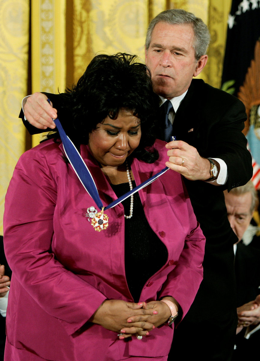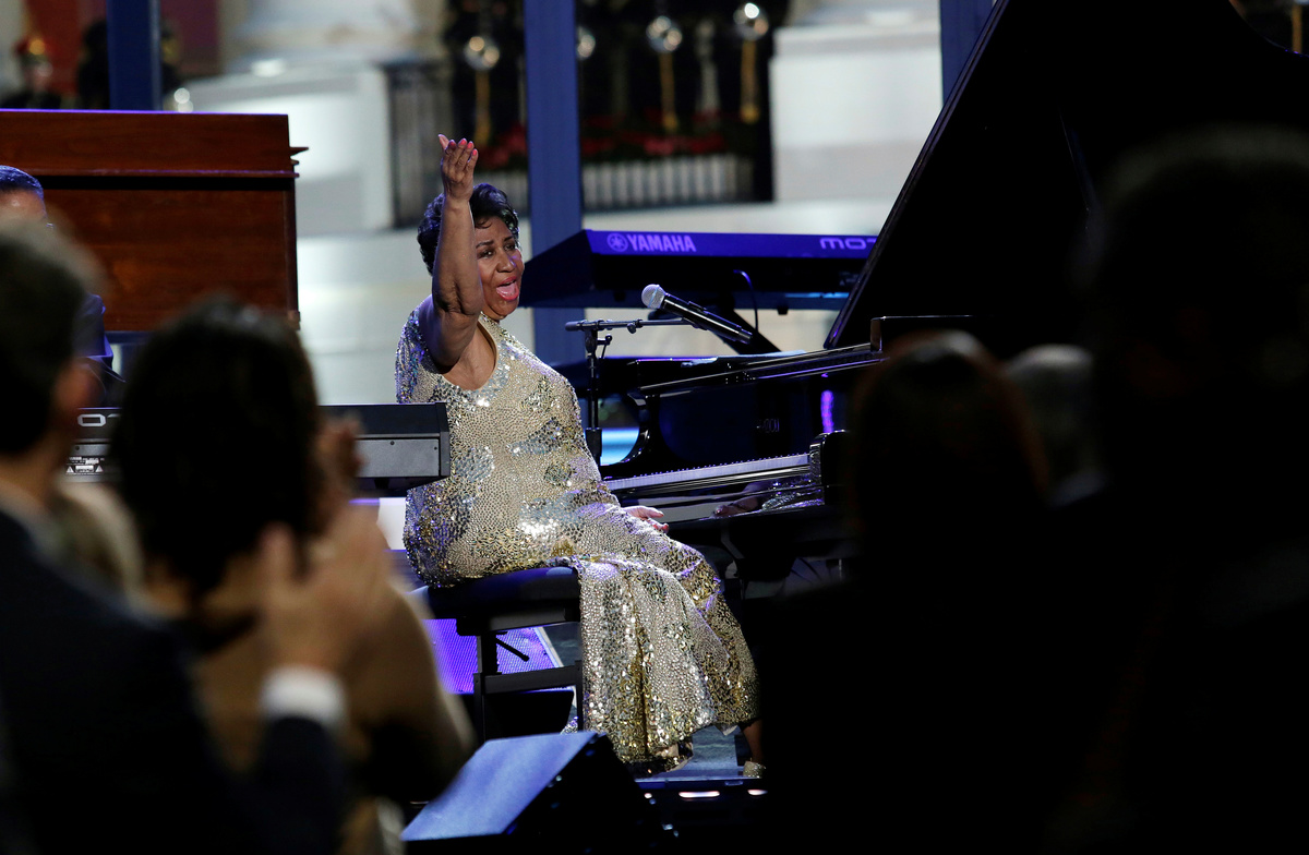 Mike SegarPresident Bill Clinton gives Aretha Franklin a standing ovation during her performance at the White House Correspondents Association Dinner Saturday, May 1, 1999. REUTERS/Pat BenicAretha Franklin opens at Caesars Palace in Las Vegas, Nevada, U.S., June 13, 1969. Las Vegas News Bureau/Handout via REUTERS Clive Davis, president of Arista Records escorts singer Aretha Franklin, the "Queen of Soul," as they arrived for the Arista Records pre-Grammy party February 25, 1997 at The Plaza hotel in New York. REUTERS/Fred ProuserFILE PHOTO - U.S. President George W. Bush (R) presents his Presidential Medal of Freedom to soul legend Aretha Franklin at a ceremony in the East Room of the White House in Washington in this November 9, 2005. REUTERS/Jason Reed/File PhotoSinger Aretha Franklin and actor Kirk Douglas (C) listen to composer Morton Gould, after they received the 17th annual Kennedy Center Honor December 4. The honorees received the award for their contribution to the American artsFILE PHOTO - Singer Aretha Franklin performs at the Candie's Foundation 10th anniversary Event to Prevent benefit New York May 3, 2011. REUTERS/Eric Thayer/File PhotoFILE PHOTO - Singer Aretha Franklin arrives at the Candie's Foundation 10th anniversary Event to Prevent benefit New York May 3, 2011. REUTERS/Eric Thayer/File PhotoFILE PHOTO - Actor Tyler Perry presents Aretha Franklin with the Vanguard Award at the 39th Annual NAACP Image Awards at the Shrine auditorium in Los Angeles February 14, 2008. REUTERS/Mario Anzuoni/File PhotoFILE PHOTO - Previous Kennedy Center Honoree and Motown singer Aretha Franklin waves as she is joined by her escort Richard Gibbs as they pose for photographers on the red carpet as they arrive for the 2012 Kennedy Center Honors gala dinner at the U.S. State Department, in Washington DC, December 1, 2012. REUTERS/Mike Theiler/File PhotoSinger Luciano Pavarotti gestures towards singer Aretha Franklin during a photo opportunity at the 1998 MusiCares benefit dinner in New York February 23, 1998. REUTERS/Fred ProuserSinger Aretha Franklin poses with Blues Brothers John Goodman J. Evan Bonifant, Joe Morton and Dan Ackroyd after performing her song, Respect at the Grammy Awards in New York City, February 25, 1998. REUTERS/Gary HershornBET honoree singer Aretha Franklin performs onstage at BET Honors 2014 at Warner Theatre in Washington on February 8, 2014. REUTERS/Jose Luis MaganaSinger Aretha Franklin sings at musician Luther Vandross' funeral service in New York's Riverside Church July 8, 2005. REUTERS/Ray Stubblebine RFS/YHAretha Franklin performs the Star-Spangled Banner on the National Mall during the 2003 NFL Kickoff Live concert in Washington, D.C., on September 4, 2003. REUTERS/Molly RileyFILE PHOTO - Singer Aretha Franklin (L) sits courtside with Reverend Jesse Jackson during the NBA basketball game between the Detroit Pistons and Miami Heat in Auburn Hills, Michigan in this February 11, 2011. REUTERS/Rebecca Cook/File Photo