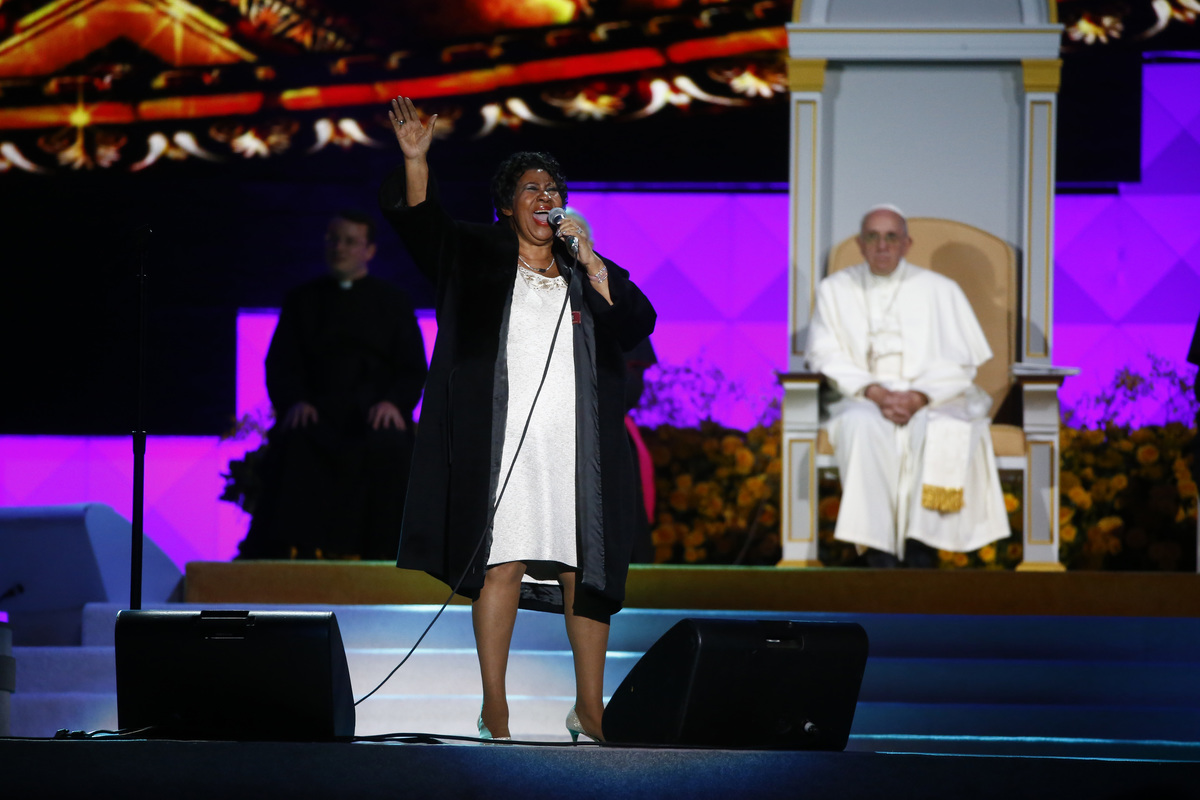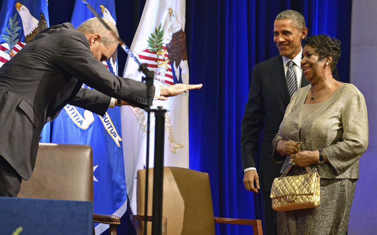 FILE PHOTO - U.S. President Barack Obama watches as first lady Michelle Obama (L) thanks singer Aretha Franklin at the dedication ceremony of the Martin Luther King, Jr. Memorial in West Potomac Park in Washington, October 16, 2011. REUTERS/Larry Downing/File PhotoSinger Aretha Franklin performs during the 85th annual Christmas tree lighting at the New York Stock Exchange December 4, 2008. REUTERS/Lucas JacksonPresident Barack Obama escorts singer Aretha Franklin as Attorney General Eric Holder bows in surprise after the unveiling of Holder's official portrait at the Dept. of Justice, in Washington, February 27, 2015. REUTERS/Mike TheilerSingers Aretha Franklin and Stevie Wonder perform together during the finale of VH1's "Divas Live: The One and Only Aretha Franklin" a live televised concert at New York's Radio City Music Hall, April 10, 2001. REUTERS/Mike SegarFormer U.S. Secretary of State Condoleezza Rice accompanies performer Aretha Franklin during a performance of the Philadelphia Orchestra in Philadelphia, Pennsylvania, July 27, 2010. REUTERS/John RandolphSinger Aretha Franklin performs at an International Jazz Day All-Star Global Concert on the South Lawn of the White House in Washington, April 29, 2016. REUTERS/Yuri GripasFILE PHOTO - Singer Aretha Franklin performs during a tribute concert to composer Marvin Hamlisch in New York September 18, 2012. REUTERS/Lucas Jackson/File PhotoFILE PHOTO - Singer Aretha Franklin performs at Radio City Music Hall in New York in this February 17, 2012. REUTERS/Shannon Stapleton/File PhotoAretha Franklin performs with the Backstreet Boys at "The One and Only Aretha Franklin" a live televised concert at New York's Radio City Music Hall, April 10, 2001. REUTERS/Mike SegarPope Francis listens as singer Aretha Franklin performs as he attends the Festival of Families rally in Philadelphia, Pennsylvania September 26, 2015. REUTERS/Tony GentileAretha Franklin and Mary J. Blige perform at "The One and Only Aretha Franklin" a live televised concert at New York's Radio City Music Hall, April 10, 2001. REUTERS/
