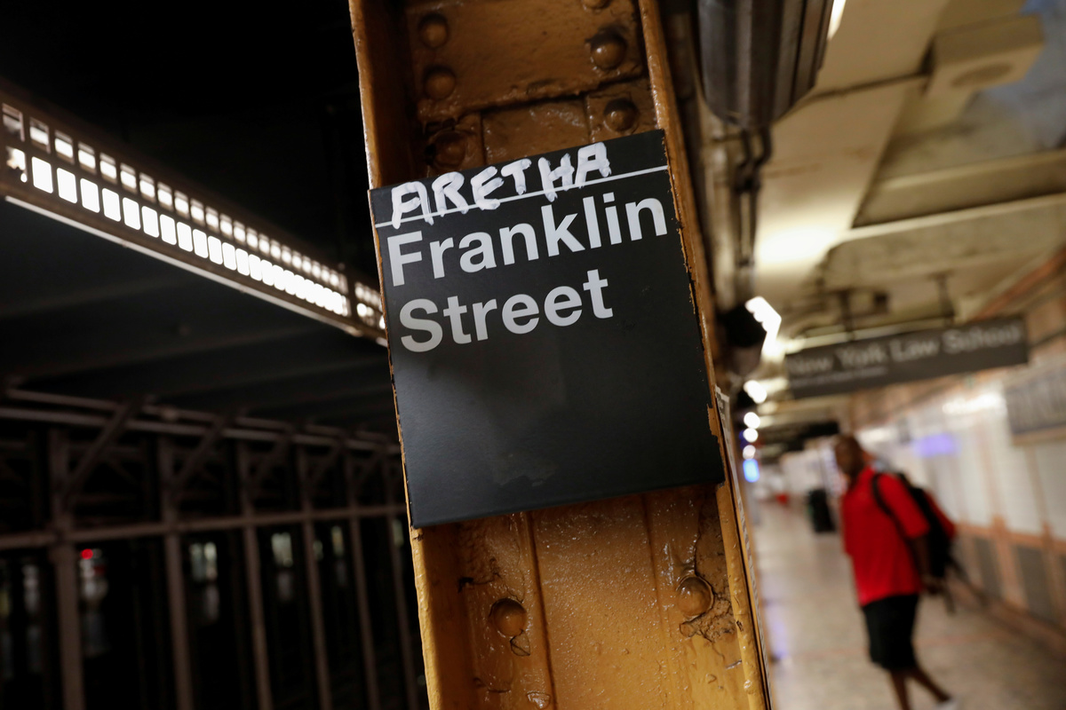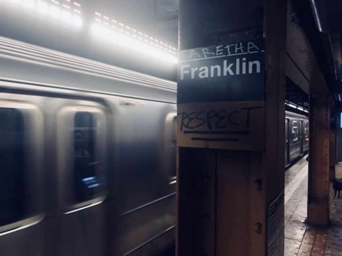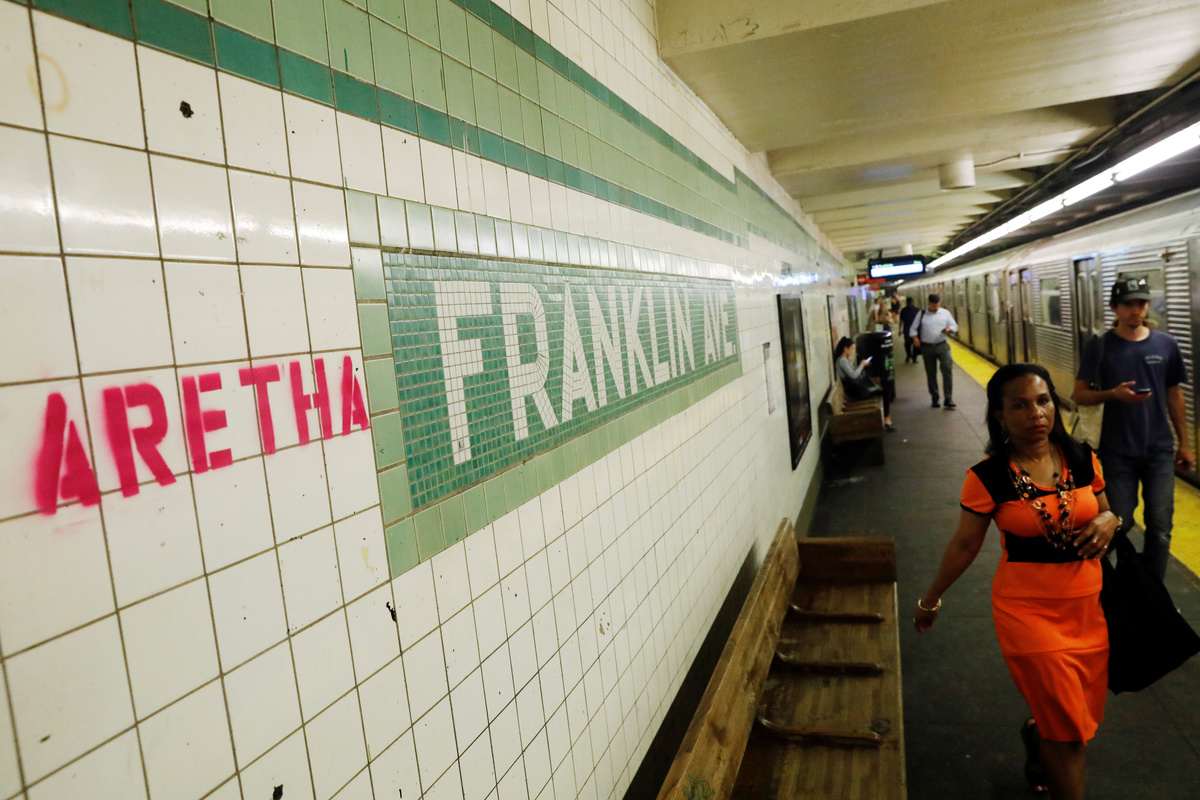 The name of Aretha is posted above the Franklin Street subway station in memory of singer Aretha Franklin in Manhattan, New York, August 16, 2018. REUTERS/Shannon Stapleton