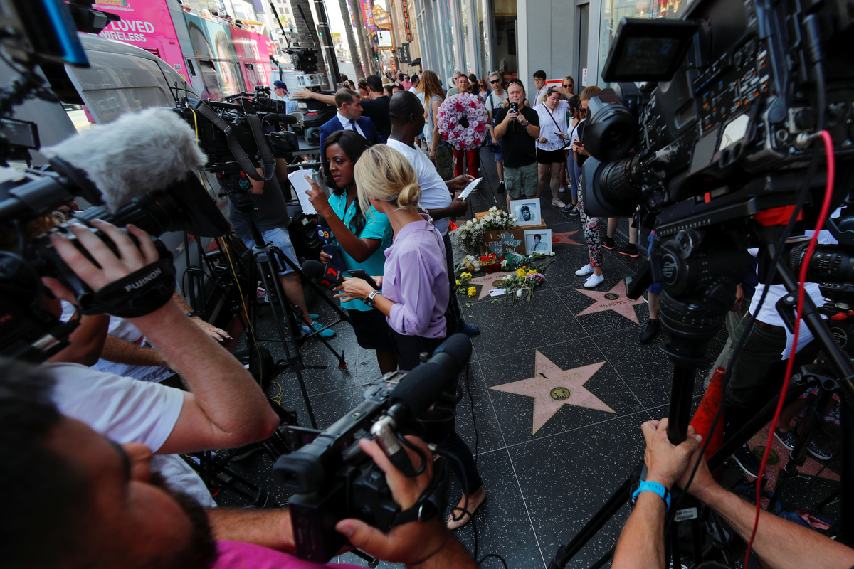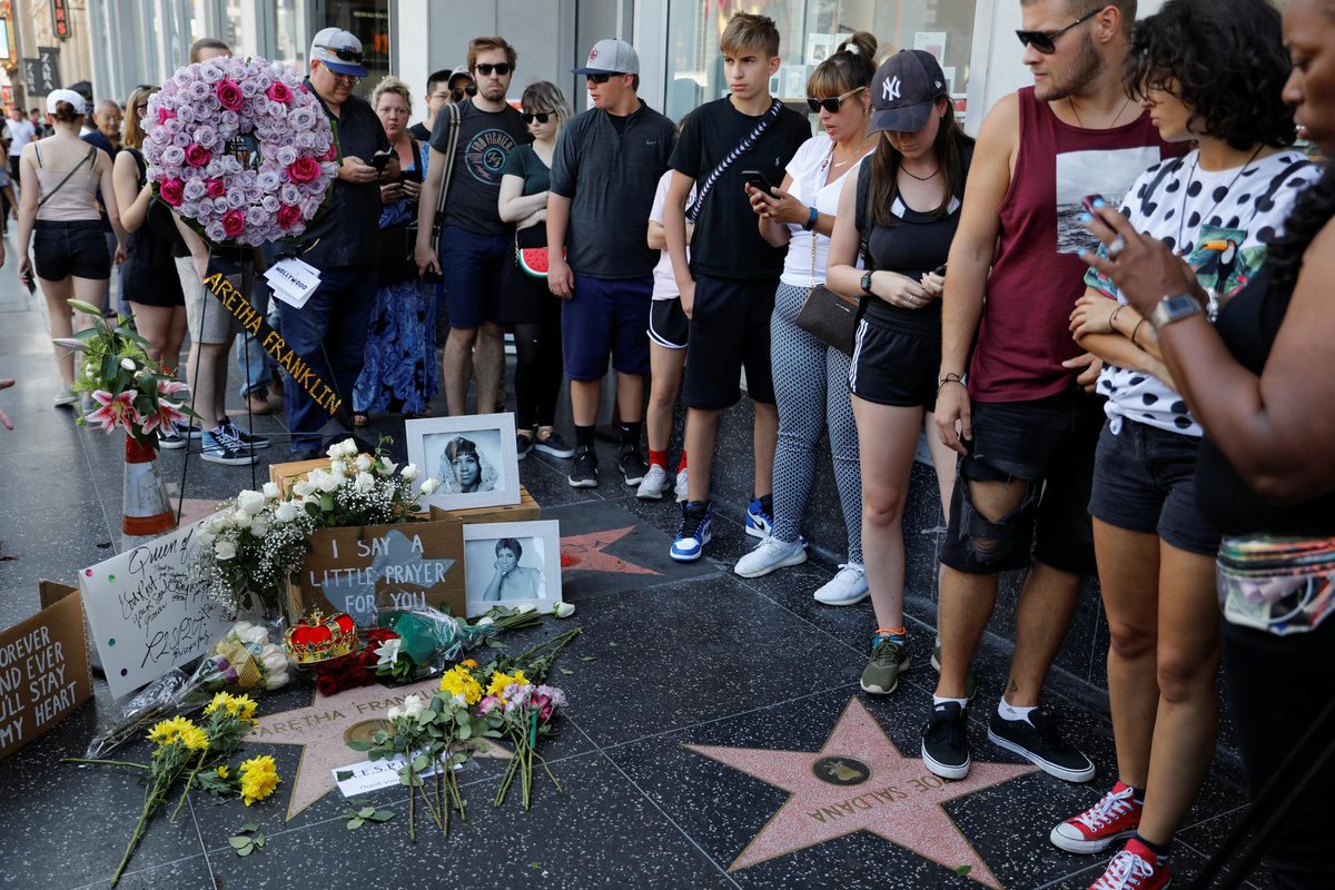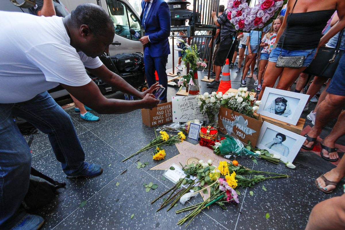 A crowd gathers around Aretha Franklin's star on Hollywood Boulevard in Los Angeles, California, U.S., August 16, 2018. REUTERS/Mike Blake