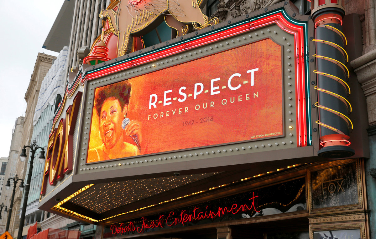 The marquee on the Fox Theater shows the word "Respect' in memory of singer Aretha Franklin in downtown Detroit, Michigan, U.S. August 16 2018. REUTERS/Rebecca Cook
