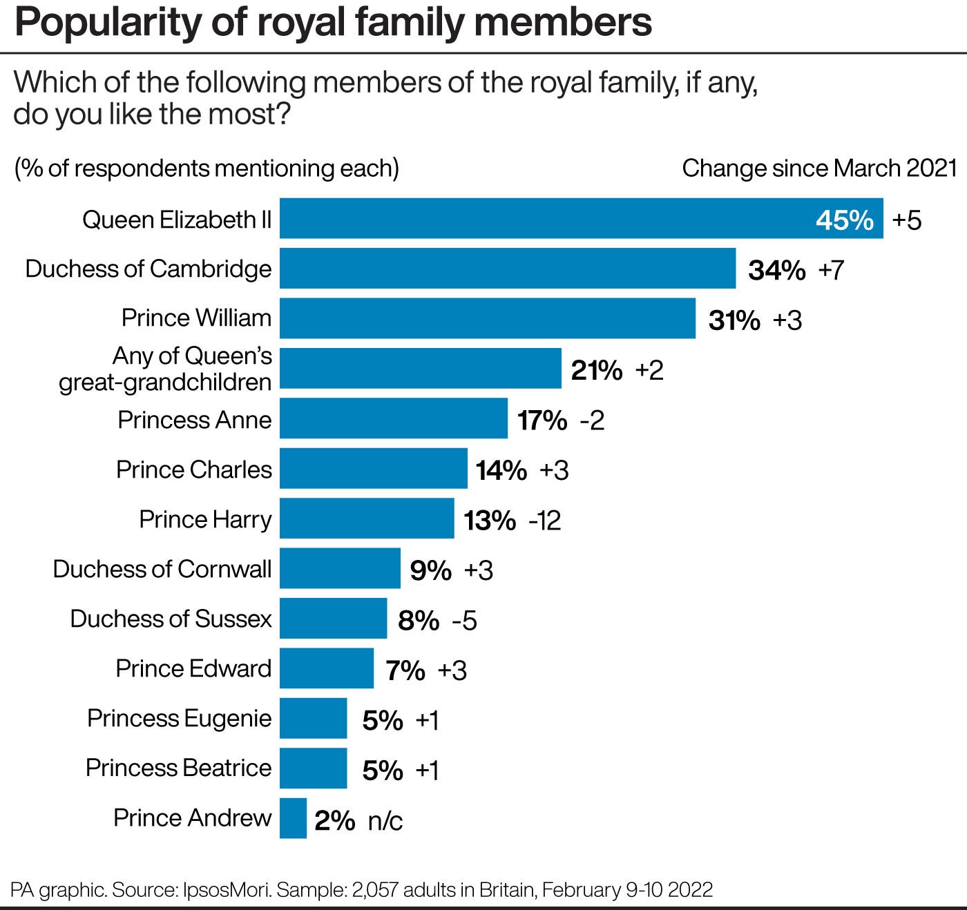 Almost half (45%) of people named the Queen as one of their most liked royals, a rise of five percentage points since March 2021, while Kate rose by seven percentage points to 34% and William increased by three points to 31%.