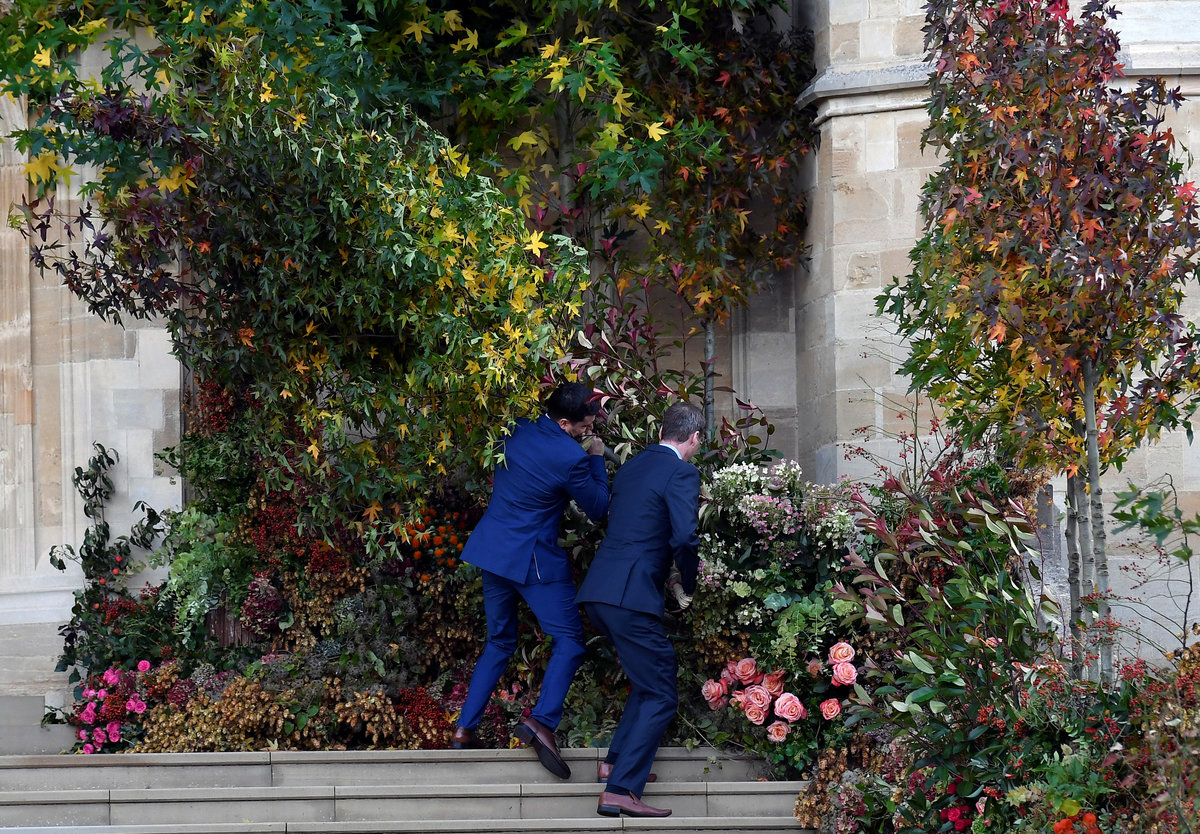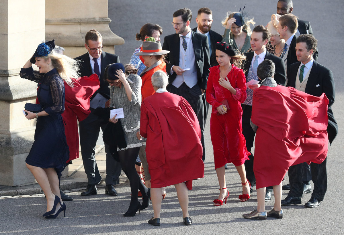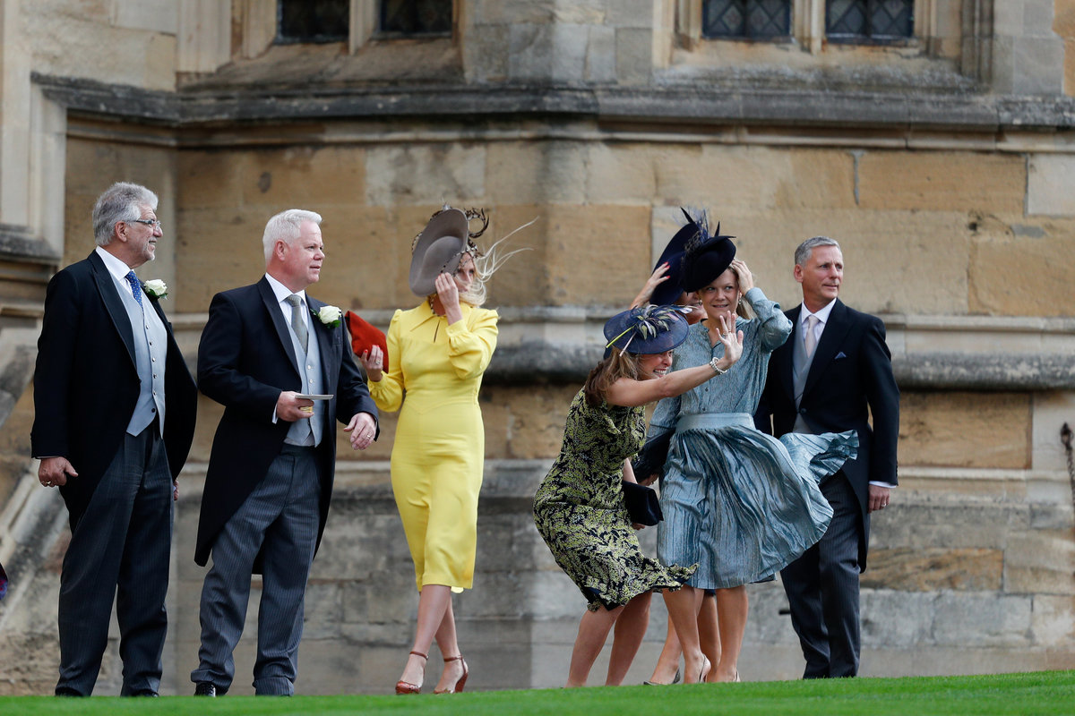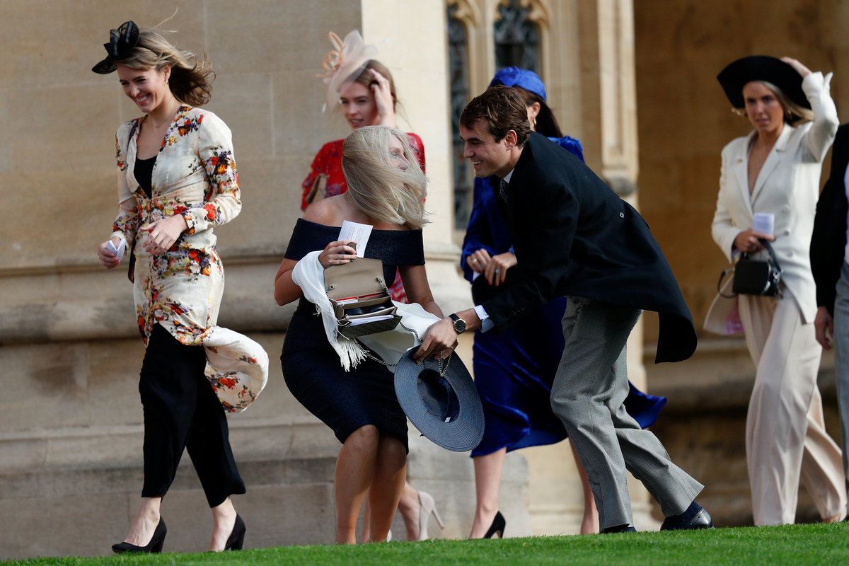 Two women wait near Windsor Castle before the royal wedding of Britain's Princess Eugenie and Jack Brooksbank in Windsor, Britain October 12, 2018. REUTERS/Darren StaplesGuests arrive ahead of the wedding of Princess Eugenie to Jack Brooksbank at St George's Chapel in Windsor Castle, Windsor, Britain, October 12, 2018. Gareth Fuller/Pool via REUTERSPixie Geldof at the wedding of Princess Eugenie to Jack Brooksbank at St George's Chapel in Windsor Castle, Windsor, Britain, October 12, 2018. Yui Mok/Pool via REUTERSFashion designer David Emanuel arrives at the wedding of Princess Eugenie to Jack Brooksbank at St George's Chapel in Windsor Castle, Windsor, Britain, October 12, 2018. Gareth Fuller/Pool via REUTERSGuests arrive to attend the wedding of Britain's Princess Eugenie of York to Jack Brooksbank at St George's Chapel, Windsor Castle, in Windsor, Britain, October 12, 2018. Adrian Dennis/Pool via REUTERSHeather Kerzner (right) during the wedding of Princess Eugenie to Jack Brooksbank at St George's Chapel in Windsor Castle, Windsor, Britain, October 12, 2018. Gareth Fuller/Pool via REUTERSArmed police officers secure the Long Walk towards Windsor Castle before the royal wedding of Britain's Princess Eugenie and Jack Brooksbank in Windsor, Britain October 12, 2018. REUTERS/Dylan MartinezGuests wait for the royal wedding of Princess Eugenie and Jack Brooksbank in Windsor Castle, Windsor, Britain October 12, 2018. REUTERS/Toby MelvilleWedding guests hold onto their headwear in the windy conditions as they arrive for the wedding of Princess Eugenie to Jack Brooksbank at St George's Chapel in Windsor Castle, Windsor, Britain, October 12, 2018. Andrew Matthews/Pool via REUTERSChelsy Davy and a guest arrive for the wedding of Princess Eugenie to Jack Brooksbank at St George's Chapel in Windsor Castle, Windsor, Britain, October 12, 2018. Matt Crossick/Pool via REUTERSBritain's Princess Eugenie and Jack Brooksbank leave Windsor Castle a day ahead of their wedding in Windsor, Britain, October 11, 2018. REUTERS/Dylan MartinezAn onlooker is seen watching from a window of a building inside Windsor Castle as guests arrive to attend the wedding of Britain's Princess Eugenie of York to Jack Brooksbank at St George's Chapel, Windsor Castle, in Windsor, Britain on October 12, 2018. Adrian Dennis/pool via REUTERSPeople try to fix foliage at St George's Chapel before the royal wedding of Princess Eugenie and Jack Brooksbank in Windsor Castle, Windsor, Britain October 12, 2018. REUTERS/Toby Melville
