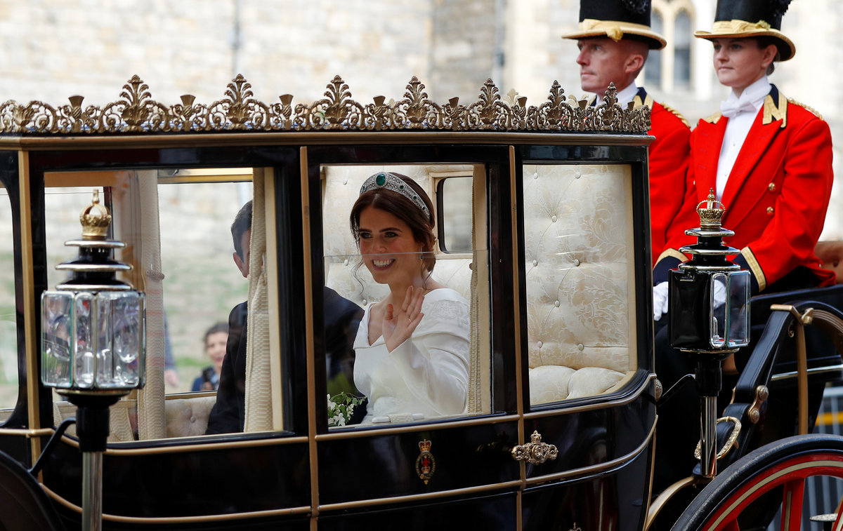 Britain's Princess Eugenie of York and her husband Jack Brooksbank travel in the Scottish State Coach at the start of their carriage procession following their wedding at St George's Chapel, Windsor Castle in Windsor, Britain, October 12, 2018. Adrian Dennis/Pool via REUTERS