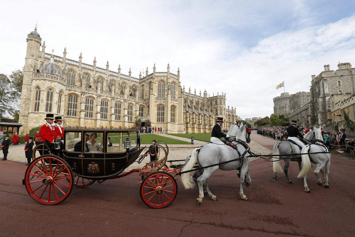 Britain's Princess Eugenie and Jack Brooksbank leave in a carriage after their wedding ceremony at Windsor Castle, Windsor, Britain October 12, 2018. REUTERS/Peter Nicholls