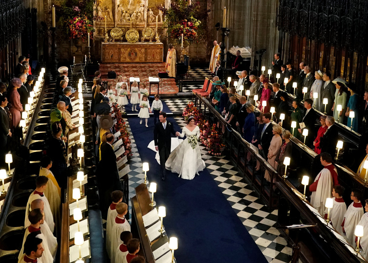 Princess Eugenie and Jack Brooksbank walk down the aisle at St George's Chapel in Windsor Castle following their wedding, in Windsor, Britain, October 12, 2018. Owen Humphreys/Pool via REUTERS