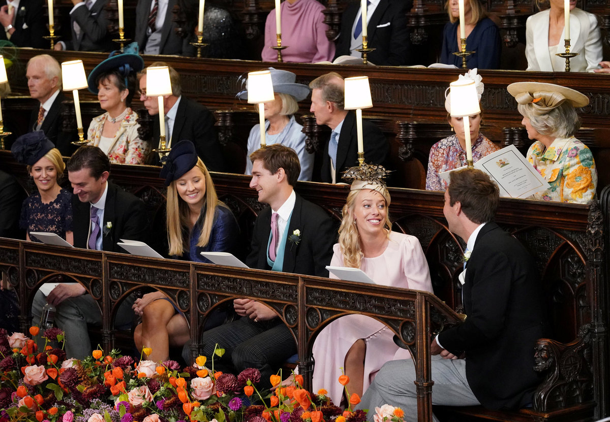 (Front row right to left) Mr and Mrs Alexander Farr, Mr and Mrs Wiliam Gayner and Mr and Mrs Rory Chichester. (2nd row right to left) Nicola Brooksbank, Amy Rodgers, Mr and Mrs David Broosksbank, Mr and Mrs Christopher Newton, John Newton take their seats ahead of the wedding of Princess Eugenie to Jack Brooksbank at St George's Chapel in Windsor Castle, Windsor, Britain, October 12, 2018. Jonathan Brady/Pool via REUTERS