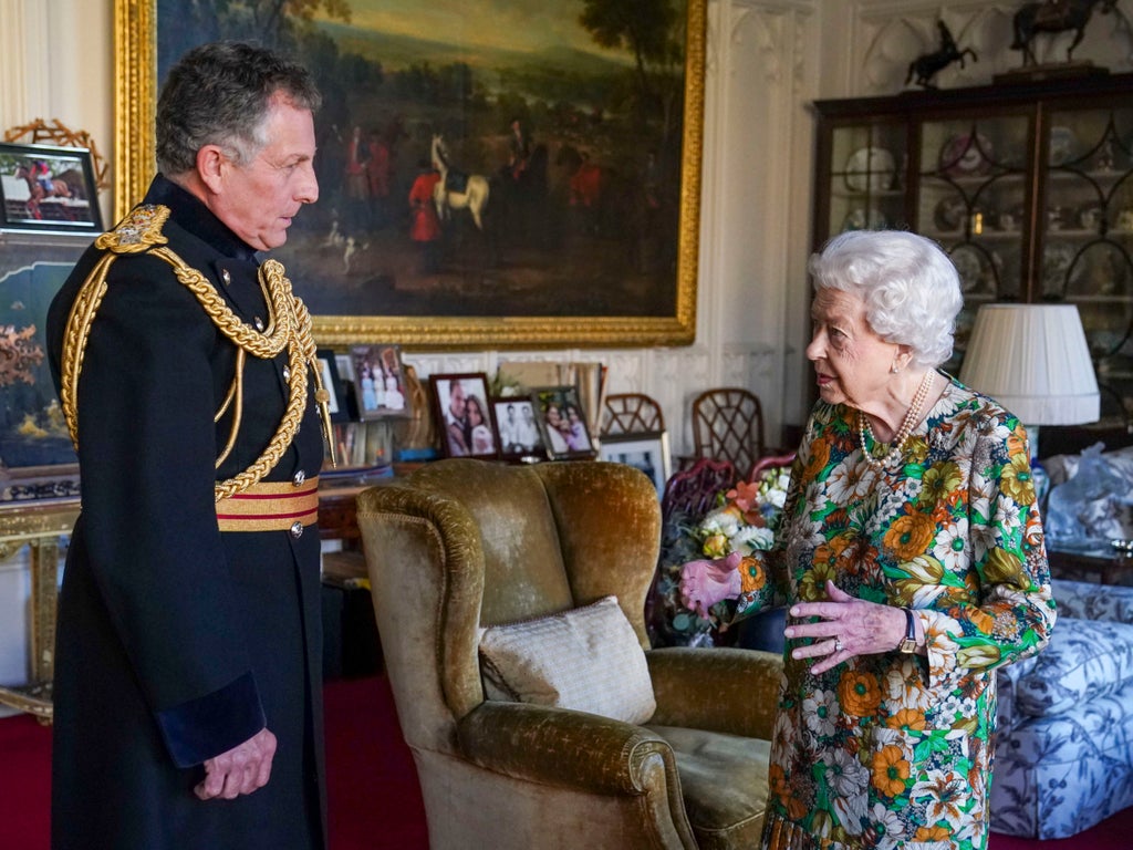 The monarch was photographed standing and smiling while meeting Britain’s most senior uniformed military adviser at Windsor Castle.