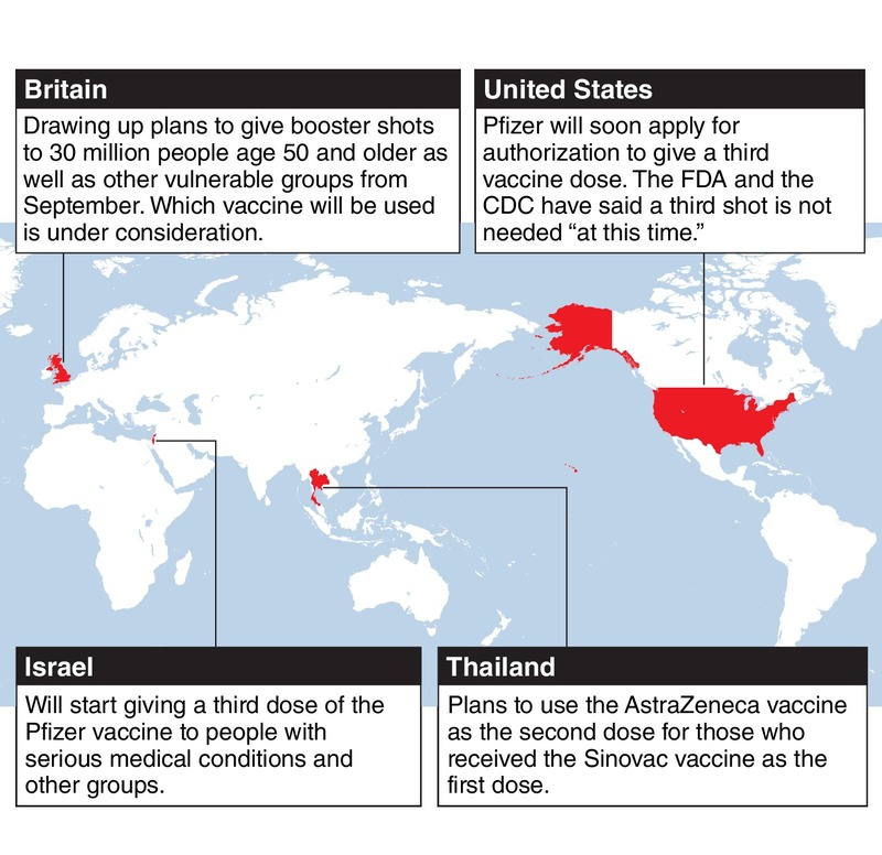 The Israeli government has started giving a third dose of the Pfizer vaccine to people with serious medical conditions and other groups. Britain is drawing up plans to give booster shots to 30 million people age 50 and older and other vulnerable groups from September. According to Reuters, France, Switzerland and Finland also are considering plans to start giving a third injection of the vaccine.