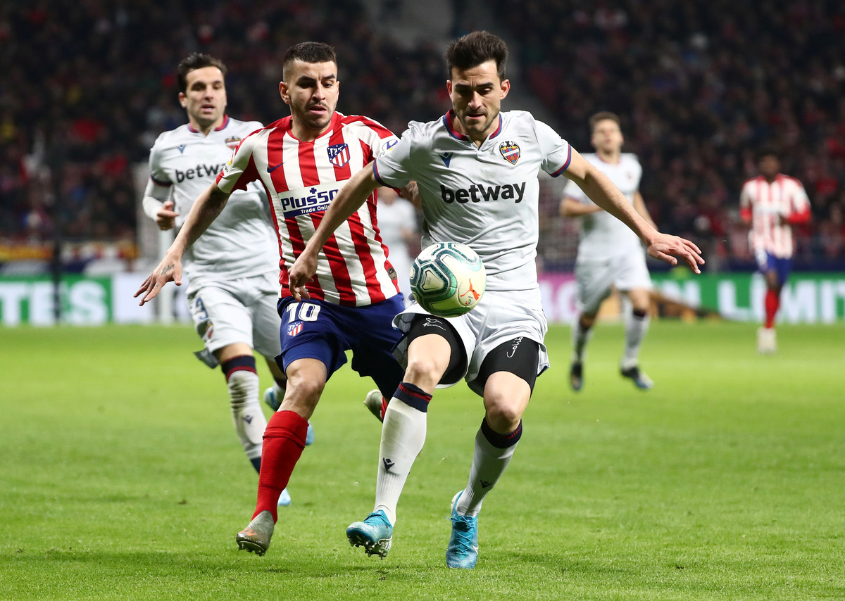 Soccer Football - La Liga Santander - Atletico Madrid v Levante - Wanda Metropolitano, Madrid, Spain - January 4, 2020 Atletico Madrid's Angel Correa in action with Levante's Sergio Postigo REUTERS/Sergio Perez