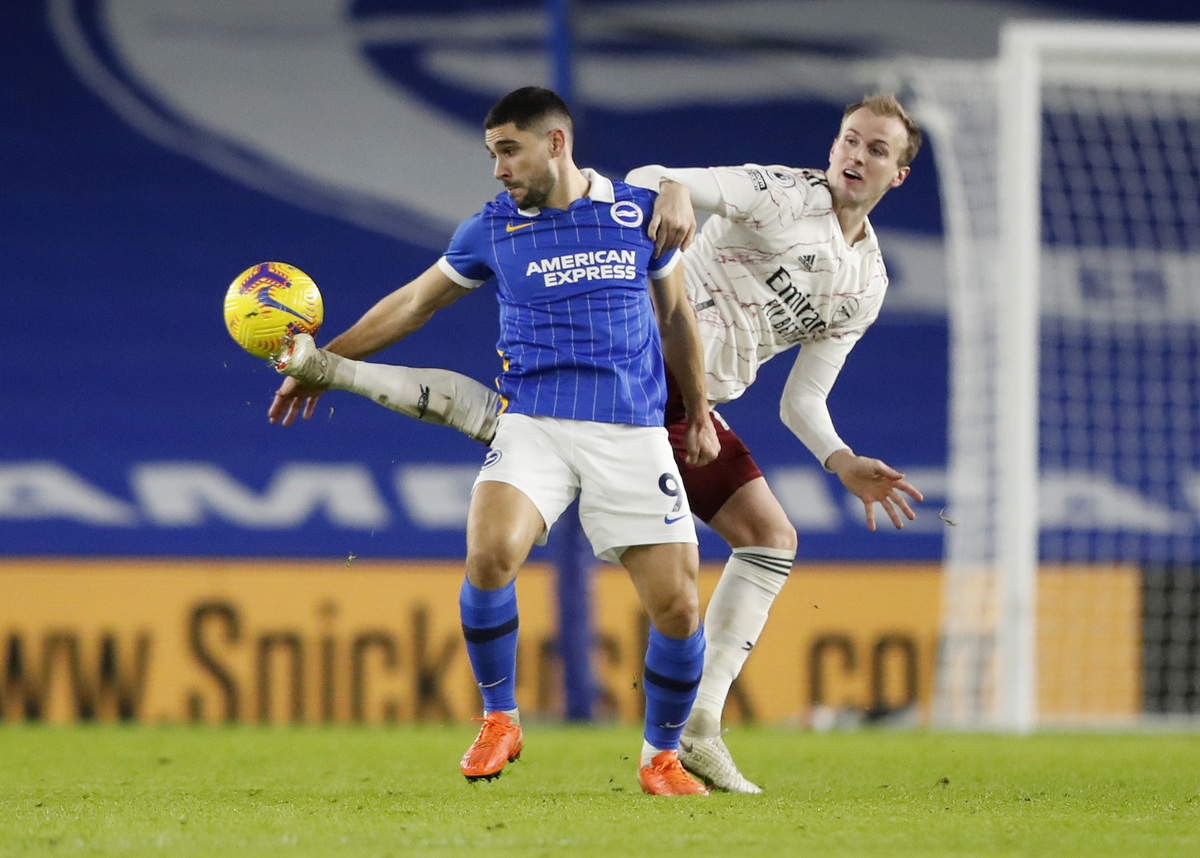 The second half opened with a penalty appeal for Brighton whose defender Lewis Dunk tripped over Mohamed Elneny as he tried to reach a corner, but the video assistant referee deemed the contact to be accidental.