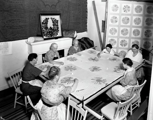 Quilting bees gained new popularity during the First and Second World Wars. Women’s Institutes, the Imperial Order Daughters of the Empire, the Canadian Red Cross and countless community and private groups mobilized women and opened make-shift workspaces including in libraries, homes and schools for charitable war-time production.