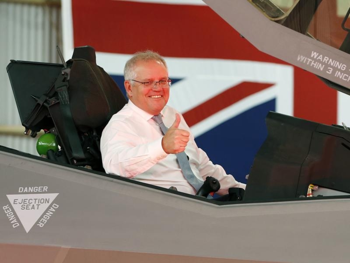 Mr Morrison channelled his inner Maverick as he climbed into the cockpit of an F-35 fighter jet flashing a broad smile and thumbs up.