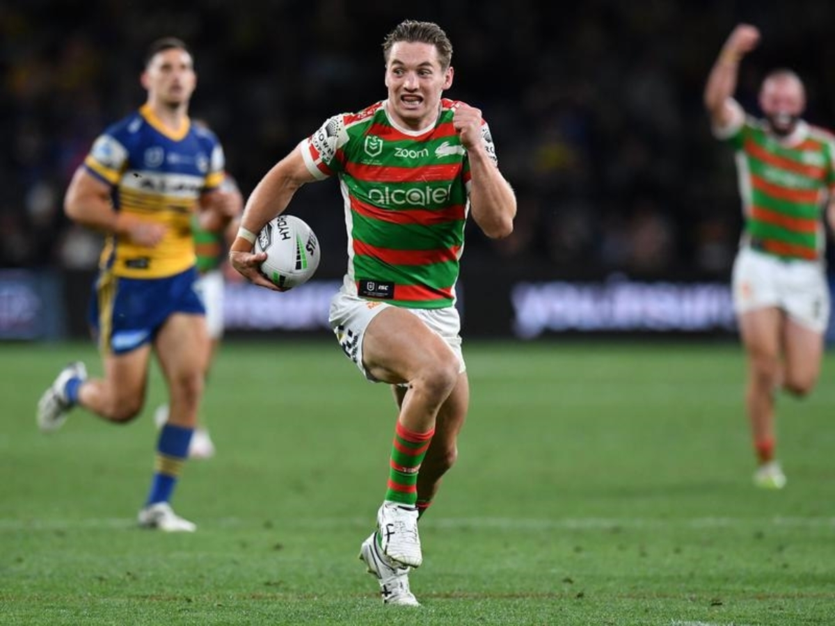 Full of steam, Souths landed on the Eels line, with Gutherson bobbling a grubber-kick from Damien Cook just enough for Bayley Sironen to ground the ball.