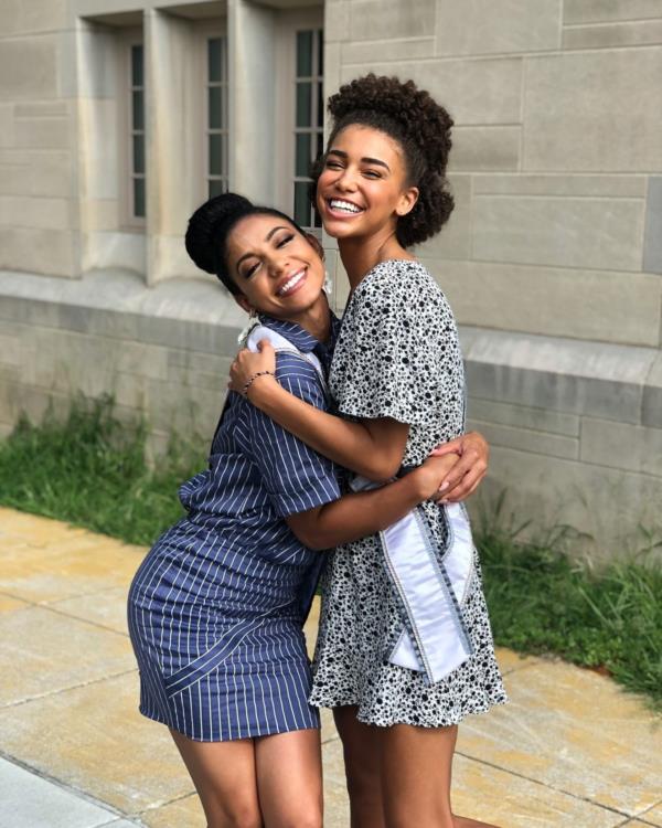 Kaliegh Garris radiates warmth and friendship, captured in a moment of joy as she poses with her friend, sharing a heartfelt embrace. The genuine smiles reflect a bond that goes beyond the camera, showcasing the beauty of camaraderie.