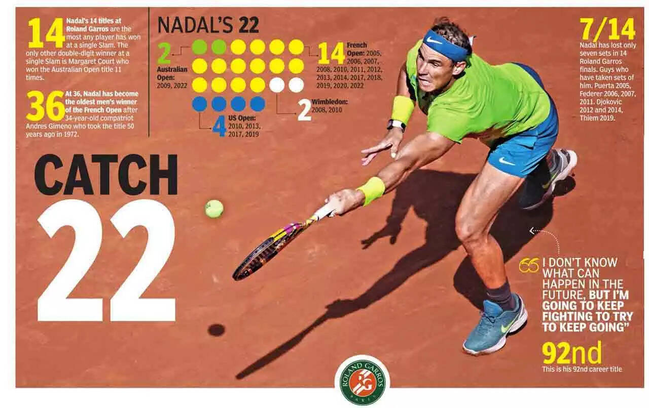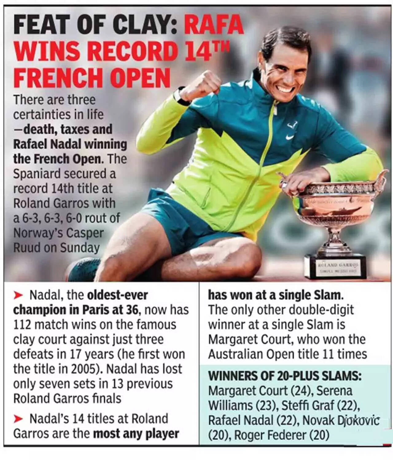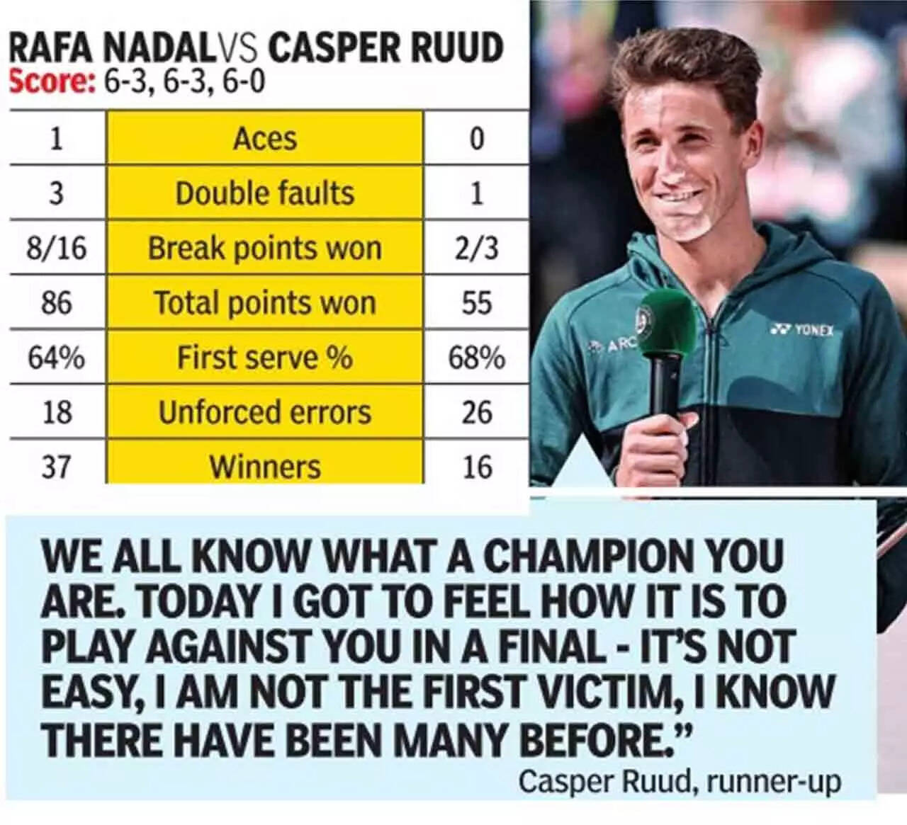 The second set saw the duo indulge in a bit of a snakes-and-ladder chase, with Ruud jumping ahead 3-1. Nadal hit back to break in the fifth game after which it appeared to be a case of more ladders than snakes for the Spaniard, who broke again in the ninth game. In the third set, with the sun smiling down on Chatrier, Nadal made it a run of 11 successive games to close it on his second match point.