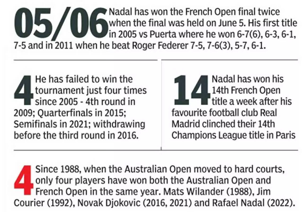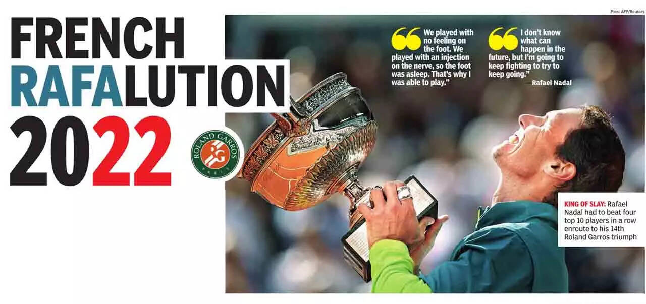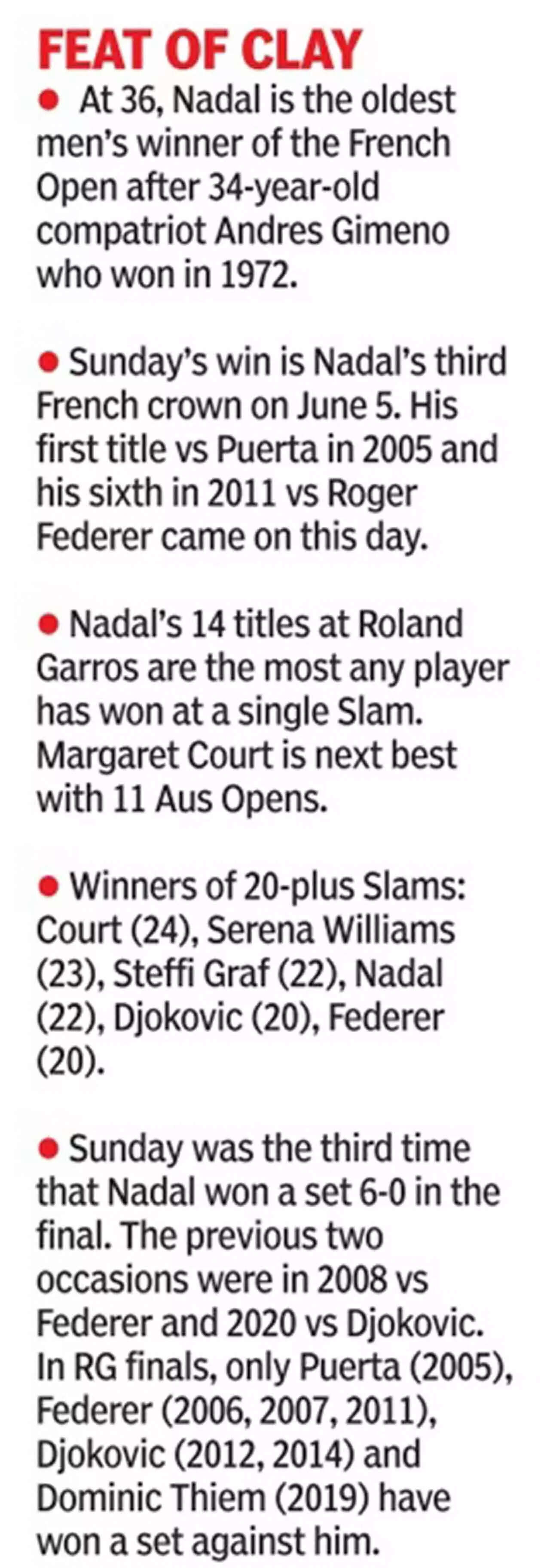 The second set saw the duo indulge in a bit of a snakes-and-ladder chase, with Ruud jumping ahead 3-1. Nadal hit back to break in the fifth game after which it appeared to be a case of more ladders than snakes for the Spaniard, who broke again in the ninth game. In the third set, with the sun smiling down on Chatrier, Nadal made it a run of 11 successive games to close it on his second match point.