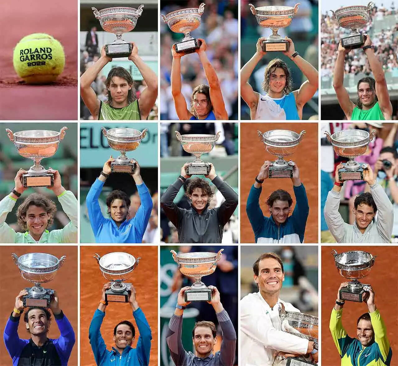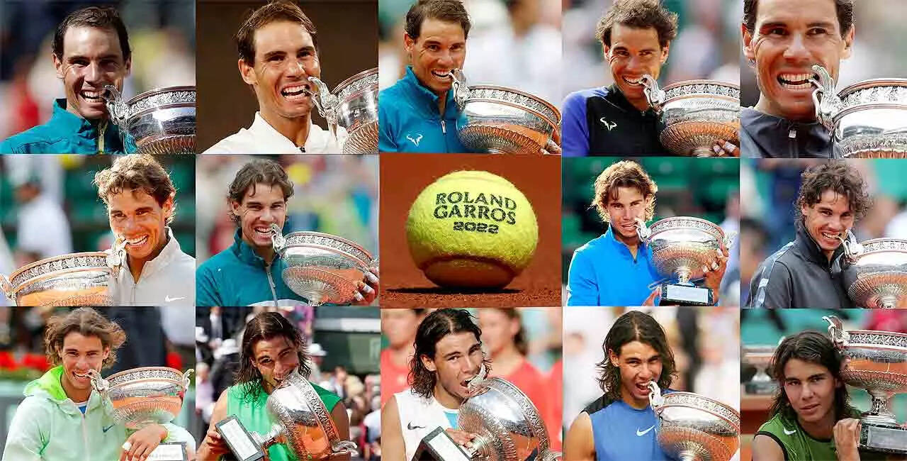 Rafael Nadal with each of his fourteen French Open Championships. (Reuters Photo)