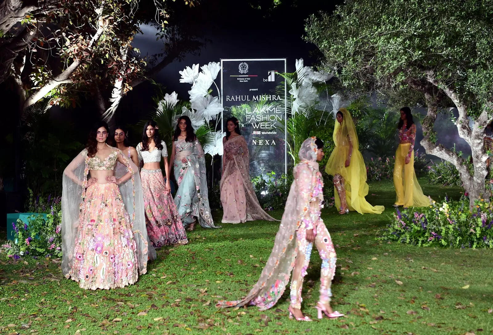 Models sauntered down the well-lit lawn wearing these floral embellished gowns, dresses and lehengas. There were sharply cut jackets, floor-skimming gowns, swirling lehengas and saris, which offered a variety of options.