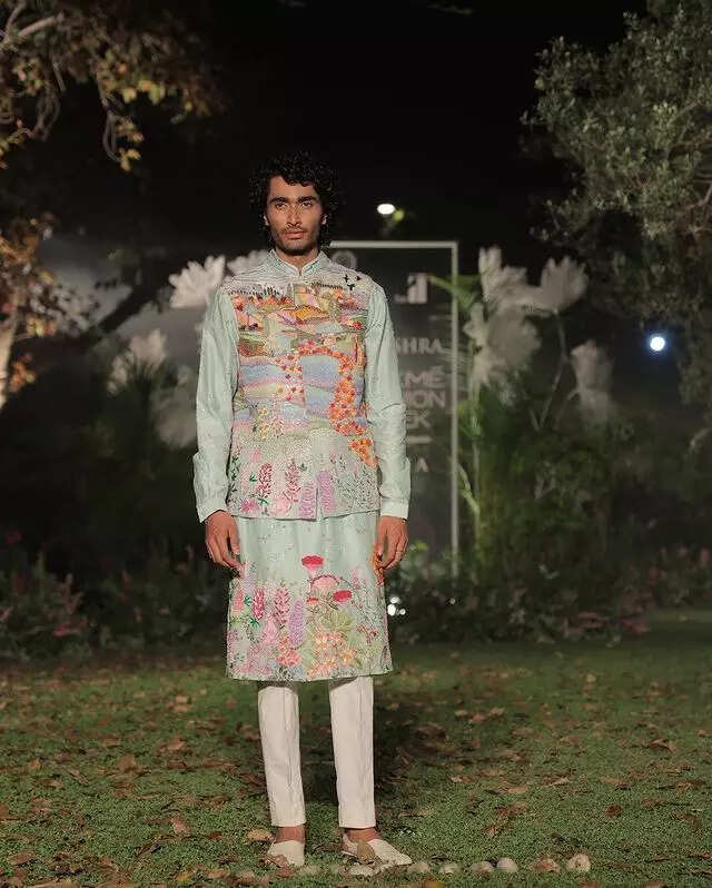 Mishra also focused on menswear this time and used floral embellishment along with shimmer in the collection. Relaxed tailoring with sheer garments added to the hotness quotient in menswear.