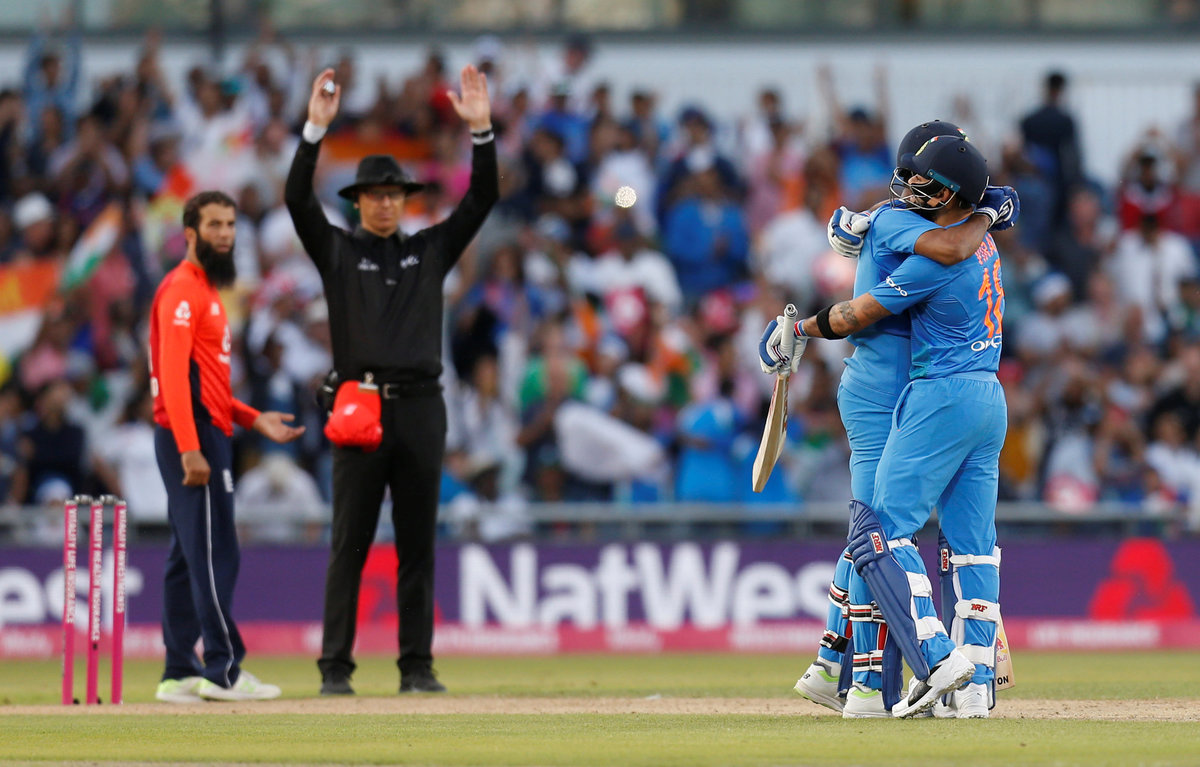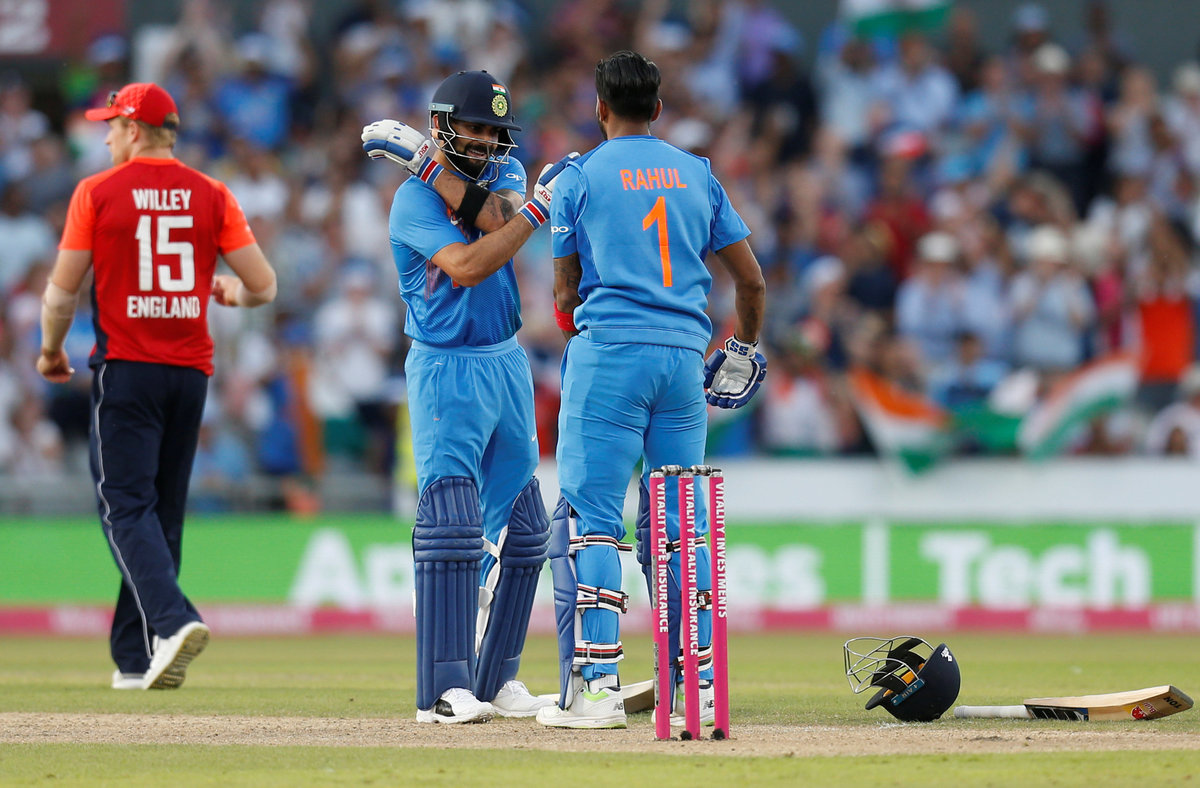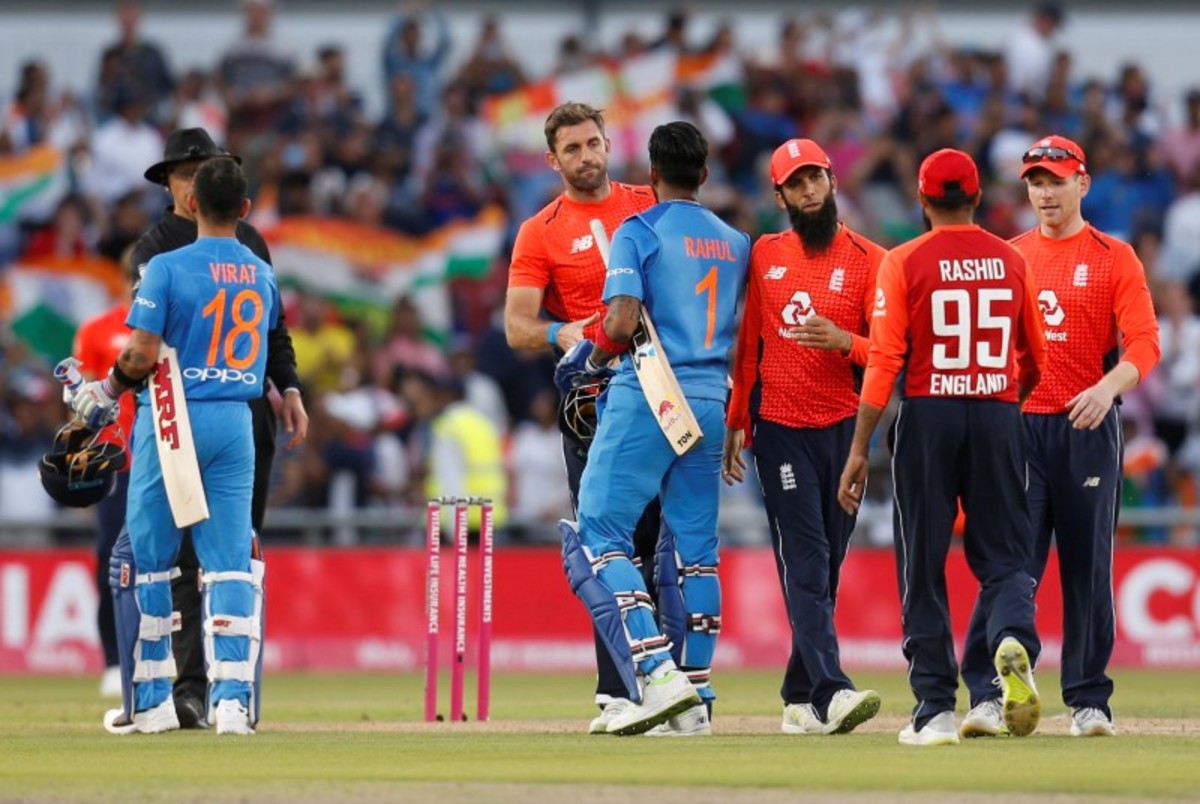 Cricket - England v India - First International T20 - Emirates Old Trafford, Manchester, Britain - July 3, 2018 England's Liam Plunkett shakes hands with India's KL Rahul after the match Action Images via Reuters/Ed SykesCricket - England v India - First International T20 - Emirates Old Trafford, Manchester, Britain - July 3, 2018 India's Virat Kohli celebrates with KL Rahul after the match Action Images via Reuters/Ed SykesCricket - England v India - First International T20 - Emirates Old Trafford, Manchester, Britain - July 3, 2018 England's Jos Buttler and Chris Jordan appeal Action Images via Reuters/Ed SykesCricket - England v India - First International T20 - Emirates Old Trafford, Manchester, Britain - July 3, 2018 England's Joe Root looks dejected Action Images via Reuters/Ed SykesCricket - England v India - First International T20 - Emirates Old Trafford, Manchester, Britain - July 3, 2018 England's David Willey celebrates taking the wicket of India's Shikhar Dhawan (not pictured) Action Images via Reuters/Ed SykesCricket - England v India - First International T20 - Emirates Old Trafford, Manchester, Britain - July 3, 2018 England's Eoin Morgan looks dejected as he walks off after losing his wicket Action Images via Reuters/Ed Sykes