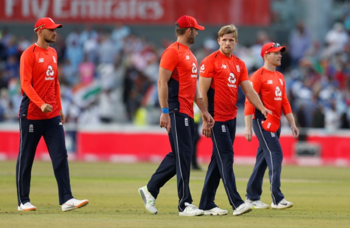 Cricket - England v India - First International T20 - Emirates Old Trafford, Manchester, Britain - July 3, 2018 England's Alex Hales, Liam Plunkett, David Willey and Eoin Morgan looks dejected after the match Action Images via Reuters/Ed Sykes