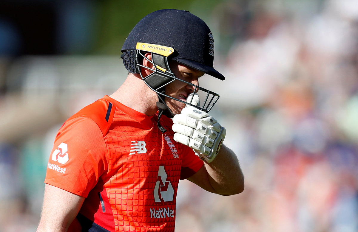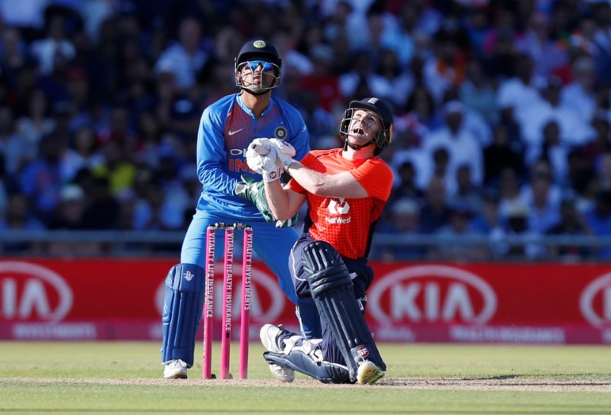 Cricket - England v India - First International T20 - Emirates Old Trafford, Manchester, Britain - July 3, 2018 England's Eoin Morgan plays a shot which is caught by India's Virat Kohli (not pictured) Action Images via Reuters/Ed Sykes