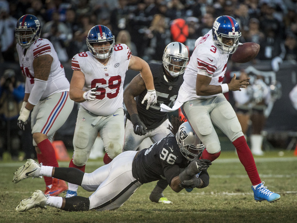 After Marquette King was bum-rushed on a punt inside the Raiders' 10 _ he didn't even have time to punt and just took the hit _ New York had a chance to take the lead before halftime. Just in time, Khalil Mack decided to be the Mack of old, almost ripping off Smith's right arm while strip-sacking the quarterback to reverse possession. Only a Giorgio Tavecchio 39-yard field goal had the Raiders ahead at halftime by a slim 10-7 margin.