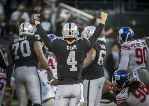 Carr was in danger of not throwing a touchdown in a game he played for the first time since Dec. 8, 2016 against the Chiefs. Right on cue, he found Johnny Holton from nine yards out with less than four minutes left to stretch the Raiders' lead back to 10.