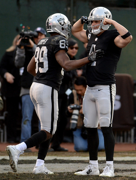 But the Raiders' refusal to back down shone through again and Carr came to life. Clive Walford made a 12-yard catch on third-and-11 to keep the drive alive and a play later, the Raiders tight end hung in the air surrounded by two defenders to haul in a 12-yard touchdown reception. Carr then rolled out and hit Seth Roberts for the tying two-point conversion.