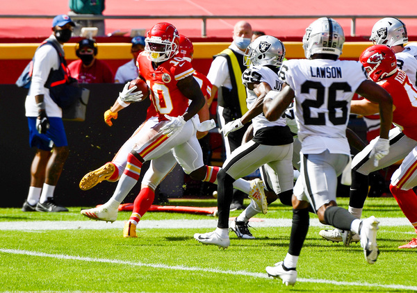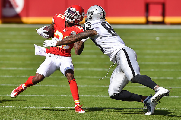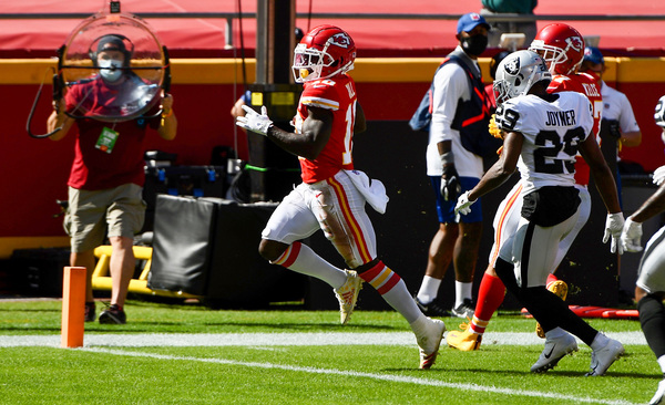 For the Chiefs, Patrick Mahomes had a three-yard touchdown run and scoring passes of 10 yards to Tyreek Hill and eight yards to Sammy Watkins. Harrison Butker also kicked a 32-yard field goal. Mahomes threw a third touchdown pass to Travis Kelce with remaining to and also hit Darryl Williams for a two-point conversion to cut the Raiders' lead to 40-32 late.