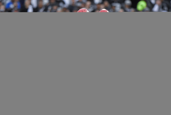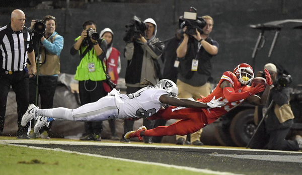 If the latest edition of Thursday Night Football hadn't been wild enough, Smith's bomb intended for Albert Wilson landed in the hands of Oakland safety Keith McGill _ until it bounced out and fell to Wilson for a 63-yard touchdown. Chiefs back up six. Then Harrison Butker tacked on a field goal to put the visitors up nine heading into the final quarter. Tavecchio responded with his own chip shot _ his first make of three tries on the night � to make it a one-score affair again.