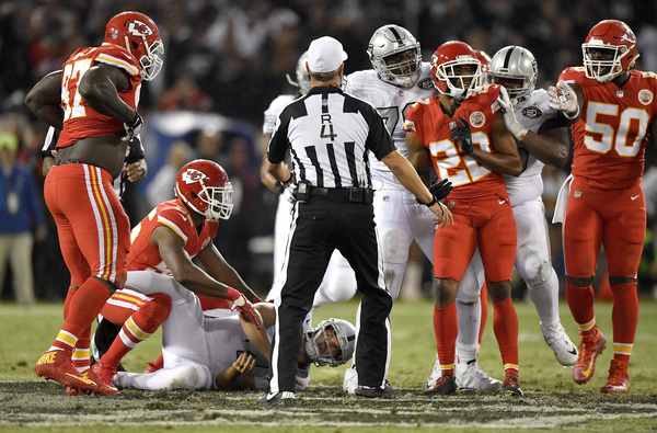 The drive consisted of a 39-yard completion from Carr to Amari Cooper kept the drive alive into Chiefs' territory. Then a 13-yard pass to Jared Cook on 4th-and-11 revived the Raiders once more. Then a touchdown-called-back to Cook that left the ball at the 1. Then a cluster of yellow flags and incompletions and one final completion to Michael Crabtree, and one final extra point by Tavecchio.