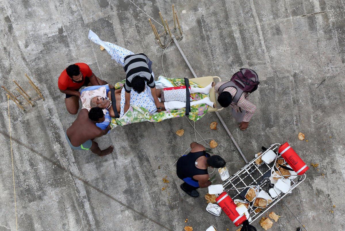 Elsewhere, a man with a cast on his leg was seen lying on the roof of a church as he awaited rescue.
