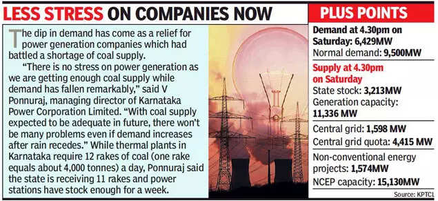 “The low demand is mainly because of low consumption by irrigation pumpsets. Industries are also consuming relatively less power, while domestic and commercial consumption remains normal,” said BR Chandrashekhar, KPTCL director (transmission).