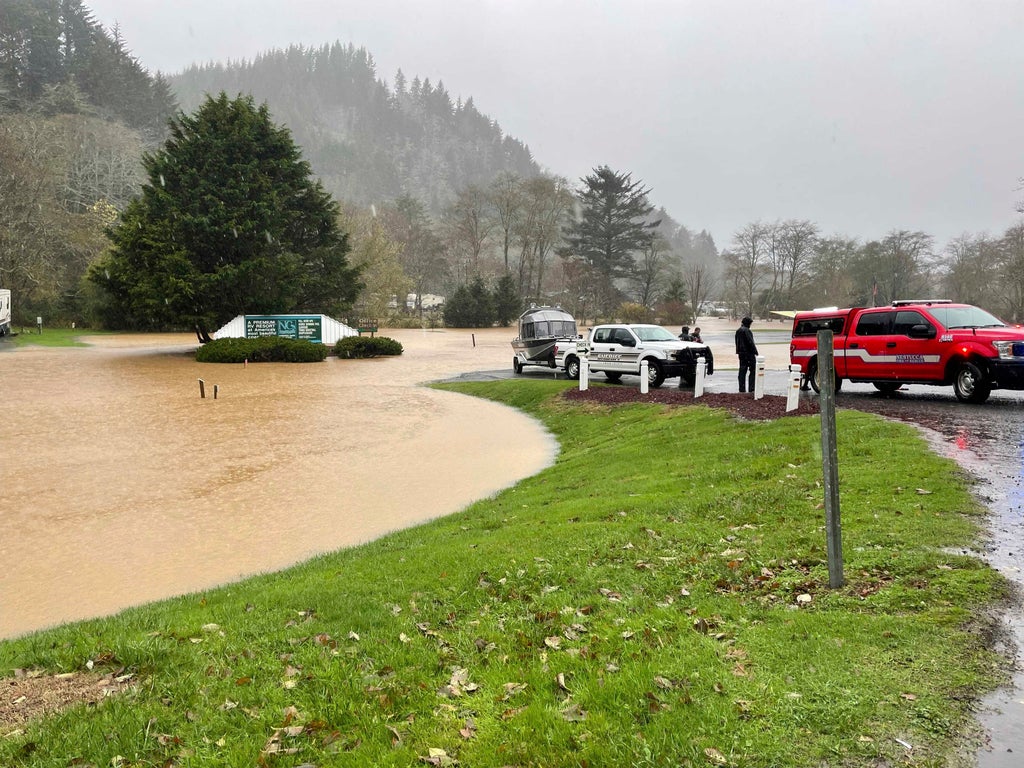 Authorities issued flood watches along Oregon's coast and warned of the possibility of dangerous mudslides in areas that burned in last summer's devastating wildfires. At the RV park about 90 miles (145 kilometers) southwest of Portland Coast Guard teams said they had rescued 12 people and three dogs and were continuing their efforts with a rescue swimmer to reach a total of about 50 people.