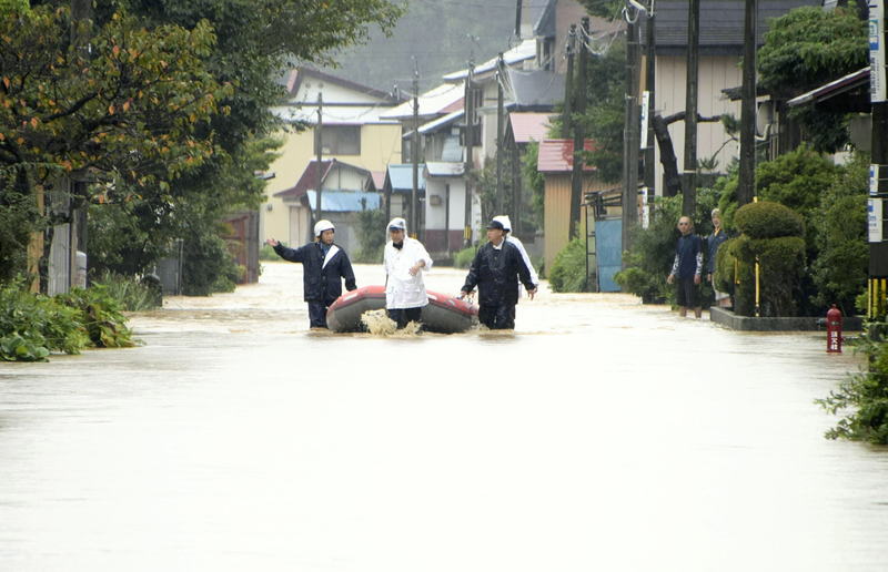 In Tozawa, roads were inundated becoming like rivers, with police officers and others rescuing residents using rubber boats.