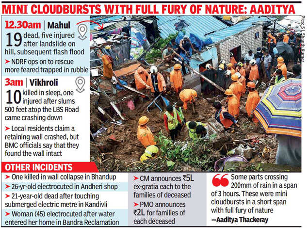 A landslide in Mahul’s Bharat Nagar claimed the most lives with 19 people reported dead till evening; rescue operations were on at time of going to press. In Vikhroli’s Surya Nagar, 10 hutment dwellers were killed as five shanties collapsed after a landslide. Both the Centre and state announced relief for the families of those killed in landslides in Mahul and Vikhroli.