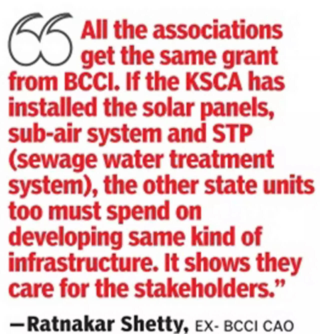 "All the associations get the same grant from the BCCI. If the KSCA has installed the solar panels, sub air system and STP (sewage water treatment system), the other state units too must spend on developing the same kind of infrastructure. It shows that they care for players, fans and all the stakeholders in the game," felt the veteran administrator.