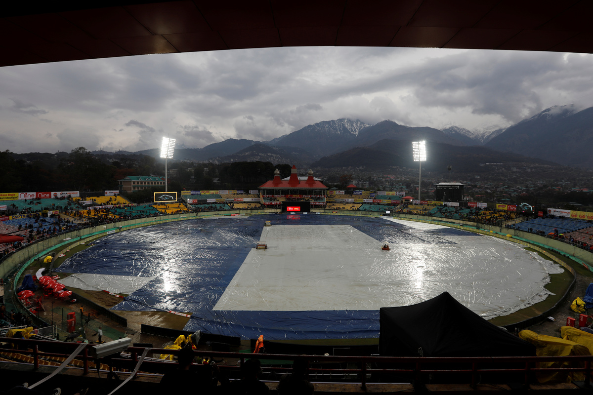 Cricket - India v South Africa - First ODI - Himachal Pradesh Cricket Association Stadium, Dharamsala, India - March 12, 2020 General view inside the stadium as the pitch is covered during the rain delay to the start of the match REUTERS/Adnan Abidi
