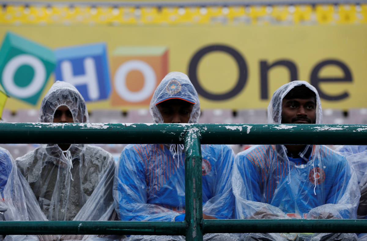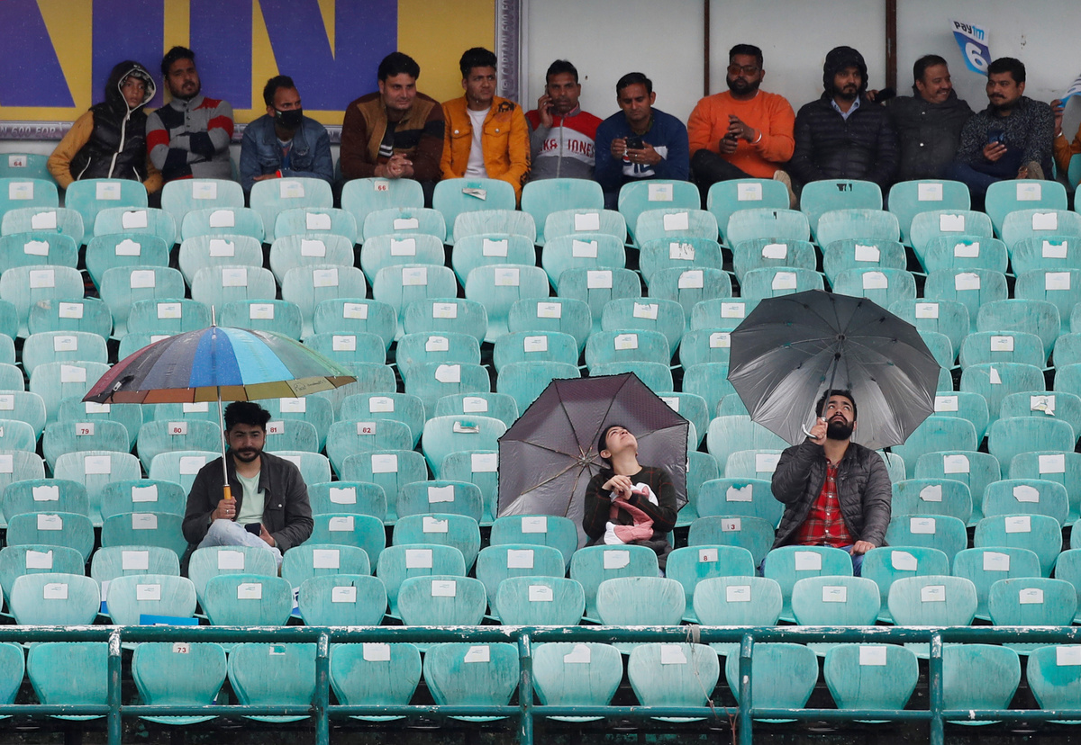 Cricket - India v South Africa - First ODI - Himachal Pradesh Cricket Association Stadium, Dharamsala, India - March 12, 2020 General view of fans using umbrellas inside the stadium as the start of the match is delayed by rain REUTERS/Adnan AbidiCricket - India v South Africa - First ODI - Himachal Pradesh Cricket Association Stadium, Dharamsala, India - March 12, 2020 General view of fans wearing rain macs inside the stadium as the start of the match is delayed by rain REUTERS/Adnan AbidiCricket - India v South Africa - First ODI - Himachal Pradesh Cricket Association Stadium, Dharamsala, India - March 12, 2020 General view of covers being placed over the pitch as the start of the match is delayed by rain REUTERS/Adnan Abidi