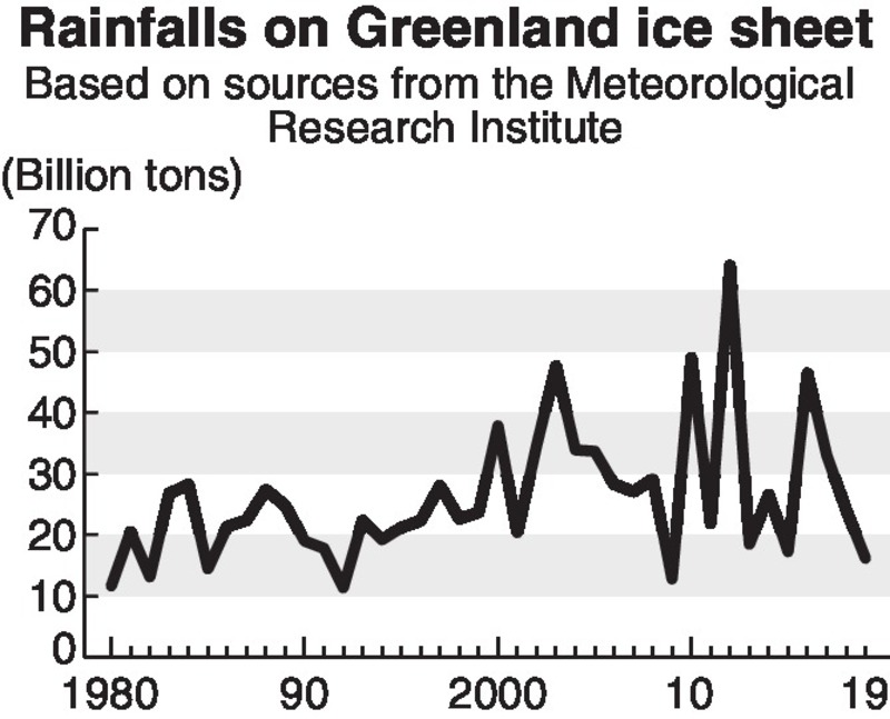 The Meteorological Agency's Meteorological Research Institute on Monday released the result of its analysis of the amount of rainfalls on the ice sheet from 1980 to 2019. After correcting the random variation of the data, it has become clear that the annual rainfall increased by 14 billion tons, or 1.7 times, in 40 years. The proportion of rainfall among all precipitation rose by 1.2 percentage points to 3.6% during that time.