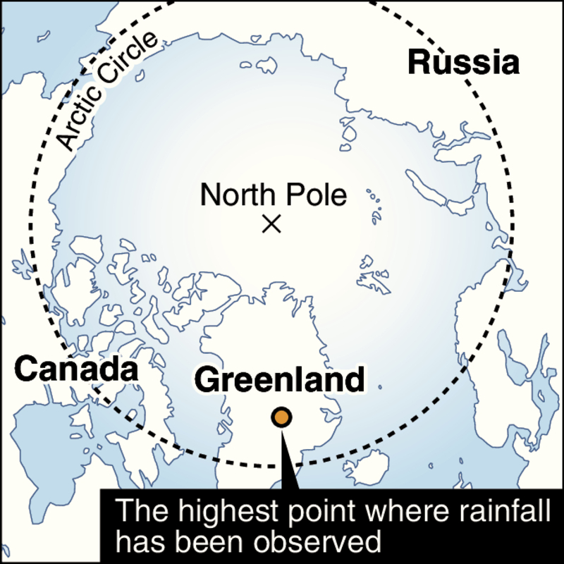 It has become apparent that rainfall has increased on the ice sheet covering most of the island in recent years, including at the highest point of 3,216 meters above sea level, where rainfall -- not snowfall -- has been observed for the first time. Those cases are believed to have occurred from the effect of global warming that is fast spreading in the Arctic Circle.